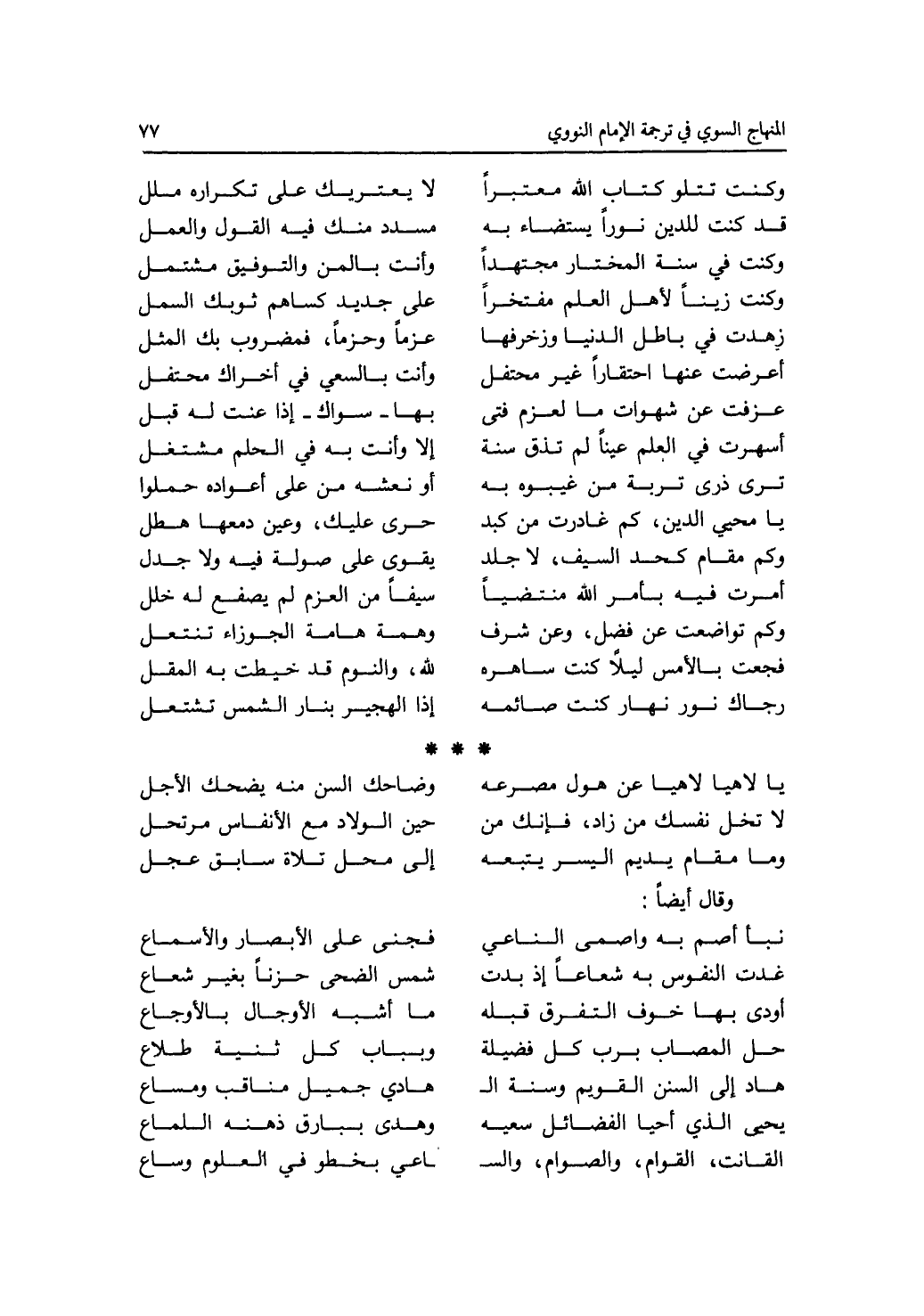 وكنت تتلو كتاب الله معتبرا * لا يعتريك على تكراره ملل قد كنت للدين نورا يستضاء به * مسدد منك فيه القول والعمل وكنت في سنة المختار مجتهدا * وأنت بالمن والتوفيق مشتمل وكنت زينا لاهل العلم مفتخرا * على جديد كساهم ثوبك السمل وهذت في باطل الدنيا وزخرفها * عزما وحزما، فمضروب بك المثل أعرضت عنها احتقارا غير محتفل * وأنت بالسعي في أخراك محتفل عزفت عن شهوات ما لعزم فتى * بها - سواك - إذا عنت له قبل عزفت عن شهوات ما لعزم فتى * بها - سواك - عنت له قبل أسهرت في العلم عينا لم تذق سنة * إلا وأنت به في الحكم مشتغل ترى ذرى تربة من غيبوه به * أو نعشه من على أعواده حملوا يا محيي الدين، كم عادرت من كبد * حرى عليك، وعين دمعها هطل وكم مقام كحد السف، لا جلد * يقوى على صولة فيه ولا جدل أمرت فيه بأمر الله منتضيا * سيفا من العزم لم يصفع له خلل وكم تواضعف عن فضل، وعن شرف * وهمة هامة الجوزاء تنتعل فجعت بالامس ليلا كنت ساهره * لله، والنوم قد خيطت به المقل رجاك نور نهار كنت صائمة * إذا الهجير بنار الشمس تشتعل * * * يا لاهيا لاهيا عن هول مصرعه * وضاحك السن منه يضحك الاجل لا تخل نفسك من زاد، فإنك من * حين الولاد مع الانفاس مرتحل وما مقام يديم اليسر يتبعه * إلى محل تلاة سابق عجل وقال أيضا: نبأ أصم به واصمى الناعي * فجنى على الابصار والاسماع غدت النفوس به شعاعاإذ بدت * شمس الضحى حزنا بغير شعاع أودى بها خوف التفرق قبله * ما أشبه الاوجال بالاوجاع حل المصاب برب كل فضيلة * وبباب كل ثنية طلاع هاد إلى السنن القويم وسنة ال * هادي جميل مناقب ومساع يحيى الذي أحيا الفضائل سعيه * وهدى ببارق ذهنه اللماع القانت، القوام، والصوام، والس * - اعي بخطو في العلوم وساع