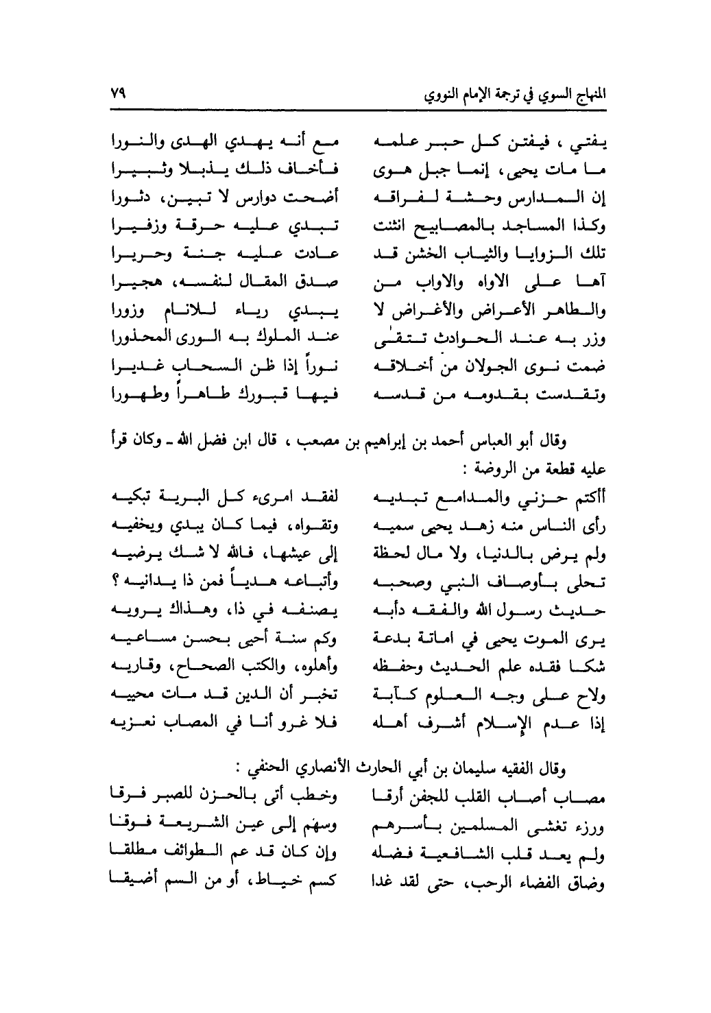 يفتي، فيفتن كل حبر علمه * مع أنه يهدي الهدى والنورا ما مات يحيى، إنما جبل هوى * قأخاف ذلك يذبلا وثبيرا إن المدارس وحشة لفراقه * أضحت دوارس لا تبين، دثورا وكذا المساجد بالمصابيح انثنت * تبدي عليه حرقة وزفيرا تلك الزوايات والثيات الخشن قد * عادت عليه جنة وحريرا آها على الاواه والاواب من * صدق المقال لنفسه، هجيرا والطاهر الاعراض والاعراض لا * يبدي رياء للانام وزورا وزر به عند الحوادث تتقى * عند الملوك به الورى المحذورا ضمن توى الجولان من أخلاقه * نورا إذا ظن السحاب غديرا وتقدست بقدومه من قدسه فيها قبورك طاهرا وطهورا وقال أبو العباس أحمد بن إبراهيم بن مصعب، قال ابن فضل الله - وكان قرأ عليه قطعة من الروضة: أأكتم حزني والمدامع تبديه * لفقد امرئ كل البرية تبكيه رأى الناس منه زهد يحيى سميه * وتقواه، فيما كان يبدي ويخفيه ولم يرض بالدنيا، ولا مال لحظة * إلى عيشها، فالله لا شك يرضيه تحلى بأوصاف النبي وصحبه * وأتباعه هديا فمن ذا يدنيه ؟ حديث رسول الله والفقه دأبه * يصنفه في ذا، وهذاك يرويه يرى الموت يحيى في اماته بدعة * وكم سنة أحيى بحستن مساعيه شكافقده علم الحديث وحفظه * وأهلوه، والكتب الصحاح، وقاريه ولاح على وجه العلوم كآبة * تخبر أن الدين قد مات محييه إذا عدم الاسلام أشرف أهله * فلا غرو أنا في المصاب نعزيه وقال الفقيه سليمان بن أبي الحارث الانصاري الحنفي: مصاب أصاب القلب للجفن أرقا * وخطب أتى بالحزن للصبر فرقا ورزء تغشى المسلمين بأسرهم * وسهم إلى عين الشريعة فوقا ولم يعد قبل الشافعية فضله * وإن كان قد عم الطوائف مطلقا وضاق القضاء الرحب، حتى لقد غدا * كسم حياط، أو من السم أضقا