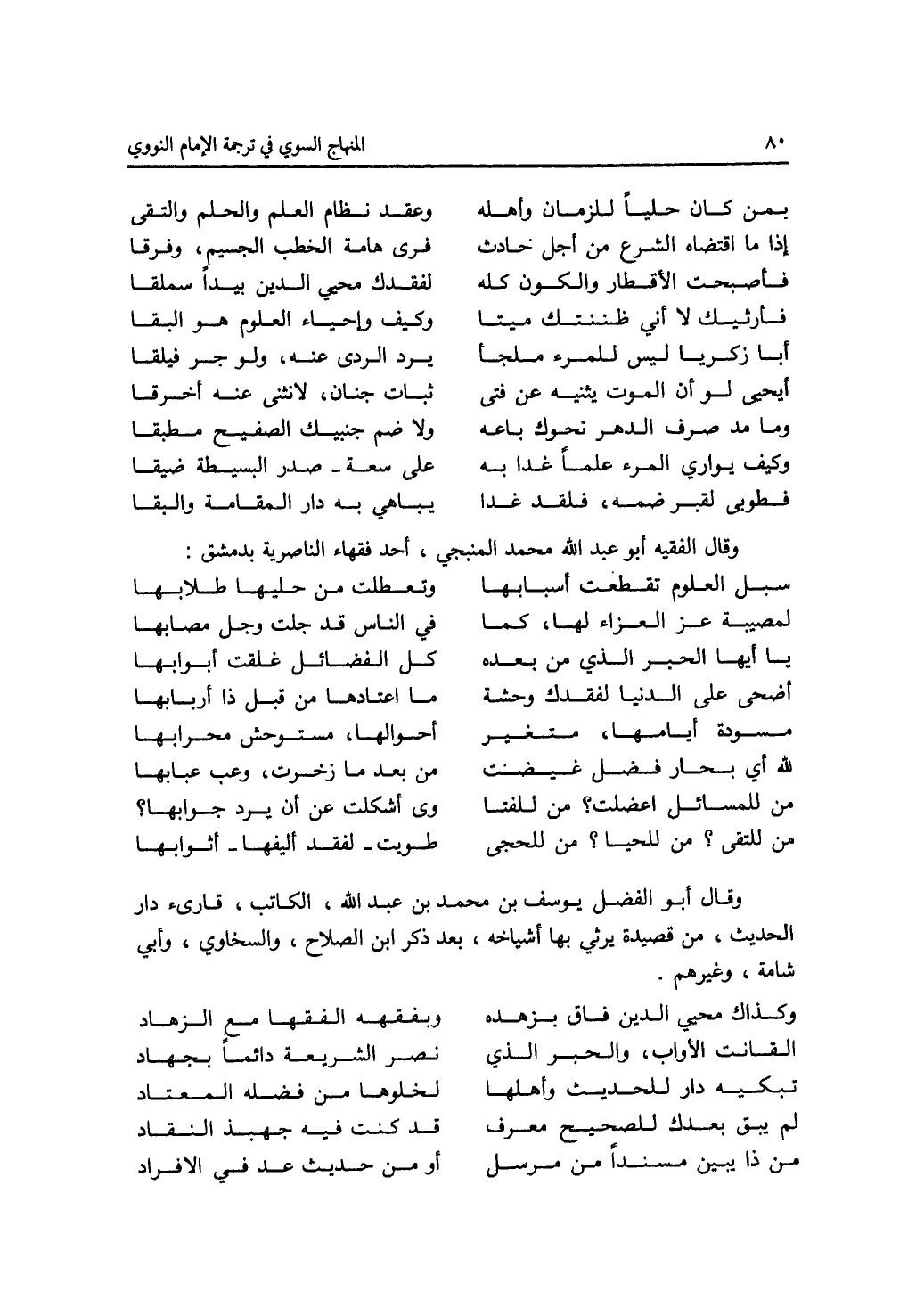 بمن كان حليا للزمان وأهله * وعقد نظام العلم والحلم والتقى إذا ما اقتضاه الشرع من أجل حادث * فرى هامة الخطب الجسيم، وفرقا فأصبحت الاقطار والكون كله * لفقدك محيي الدين بيدا سملقا فأرثيك لا أني طننتك مينا * وكيف وإحياء العلوم هو البقا أبا زكريا للمرء ملجا * يرد الردى عنه، ولو جر فيلقا أحيى ولو أن الموت يثنيه عن فتى * ثبات جنان، لانثنى عنه أخرقا وما مد صرف الدهر نحوك باعه * ولا ضم جنبيك الصفيح مطبقا وكيف يواري المرء علما غدا به * على سعة - صدر البسيطة ضيقا فطوبى لقبر ضمه، فلقد غدا * يباهي به دار المقامة والبقا وقال الفقيه أبو عبد الله محمد المنبجي، أحد فقهاء الناصرية بدمشق: سبل العلوم تقطعت أسبابها * وتعطلت من حليها طلابها لمصبية عز العزاء لها، كما * في الناس قد جلت وجل مصابها يا أيها الحبر الذي من بعده كل الفضائل غلقت أبوابها أضحى على الدنيا لفقدك وحشه * ما اعتادها من قبل ذا أربابها مسودة أيامها، متغير * أحوالها، مستوحش محرابها لله أي بحار فضل غيضت * من بعد ما زخرت، وعب عبابها من للمسائل اعضلت ؟ من للفتا * وى أشكلت عن أن يرد جوابها ؟ من للتقى ؟ من للحجى * طويت - لفقد أليفها - أثوابها وقال أبو الفضل يوسف بن محمد بن عبد الله الكاتب، قارئ دار الحديث، من قصيدة يرثي بها أشياخه، بعد ذكر ابن الصلاح، والسخاوي، وأبي شامة، وغير هم. وكذاك محيي الدين فاق بزهده * وبفقهه الفقها مع الزهاد القانت الاواب، والحبر الذي * نصر الشريعة دائما بجهاد تبكيه دار للحديث وأهلها * لخلوها من فضله المعتاد لم يبق بعدك للصحيح معرف * قد كنت فيه جهبذ النقاد من ذا يبين مسندا من مرسل * أو من حديث عد في الافراد