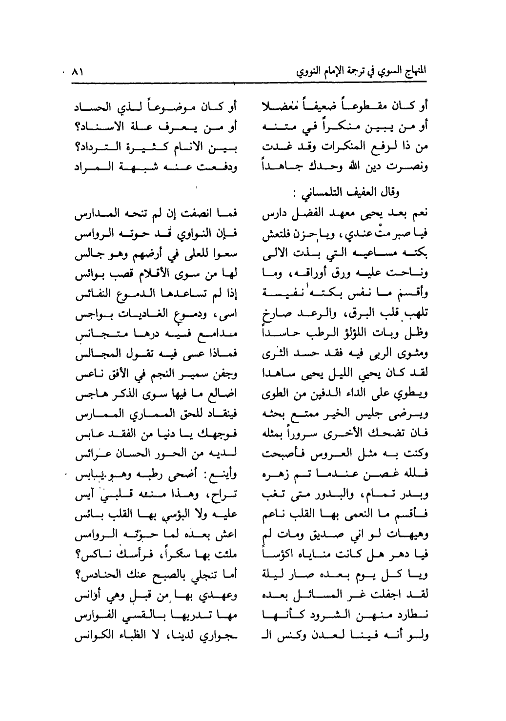 أو كان مقطوعا ضعيفا معضلا * أو كان مضوعا لذي الحساد أو من يبين منكرا في متنه * أو من يعرف علة الاسناد ؟ من ذا لرفع المنكرات وقد غدت * بين الانام كثيرة الترداد ؟ ونصرت دين الله وحدك جاهدا * ودفعت عنه شبهة المراد وقال العفيف التلمساني: نعم بعد يحيى معهد الفضل دارس * فما أنصفت إن لم تنحه المدارس فيا صبرمت عندي، ويا حزن فلتعش * فإن النواوي قد حوته الروامس بكته مساعيه التي بذت الالى * سعوا للعلى في أرضهم وهو جالس وناحت عليه ورق أوراقه، وما * لهامن سوى الاقلام قصب بوائس وأقسم ما نفس بكته نفيسه * إذا لم تساعدها الدموع النفائس تلهب قلب البرق، والدعد ضارخ * اسى، ودموع الغاديات بواجس وظل وبات اللؤلؤ الرطب حاسدا * مدامع فيه تقول المجالس ومثوى الربى فيه حسد الثرى * فماذا عسى فيه تقول المجالس لقد كان يحيي الليل يحيى ساهدا * وجفن سمير النجم في الافق ناعس ويطوي على الداء الدفين من الطوى * اضالع ما فيها سوى الذكر هاجس ويرضى جليس الخير ممتع بحثه * فينقاد للحق المماري الممارس فان تضحك الاخرى سرورا بمثله * فوجهك يا دنيا من الفقد عابس وكنت به مثل العروس فأصبحت * لديه من الحور الحسان عرائس فلله عضن عندما تم زهره * وأ ينع: أضحى رطبه وهو يابس وبدر تمام، والبدور متى تغب * تراح، وهذا منه قلبي آيس فأقسم ما النعمى بها القلب ناعم * عليه ولا البؤسى بها القلب بائس وهبهات لو اني صديق ومات لم * اعش بعده لما حوته الروامس فيا دهر هل كانت مناياه أكؤسا * ملئت بها سكرا، فرأسك ناكس ؟ لقد اجفلت غر المسائل بعده * وعهدي بها من قبل وهي أوانس نطار منهن الشرود كأنها * مها تدريها بالقسي الفوارس ولو أنه فينا لعدن وكنس ال * - جواري لدينا، لا الظياء الكوانس