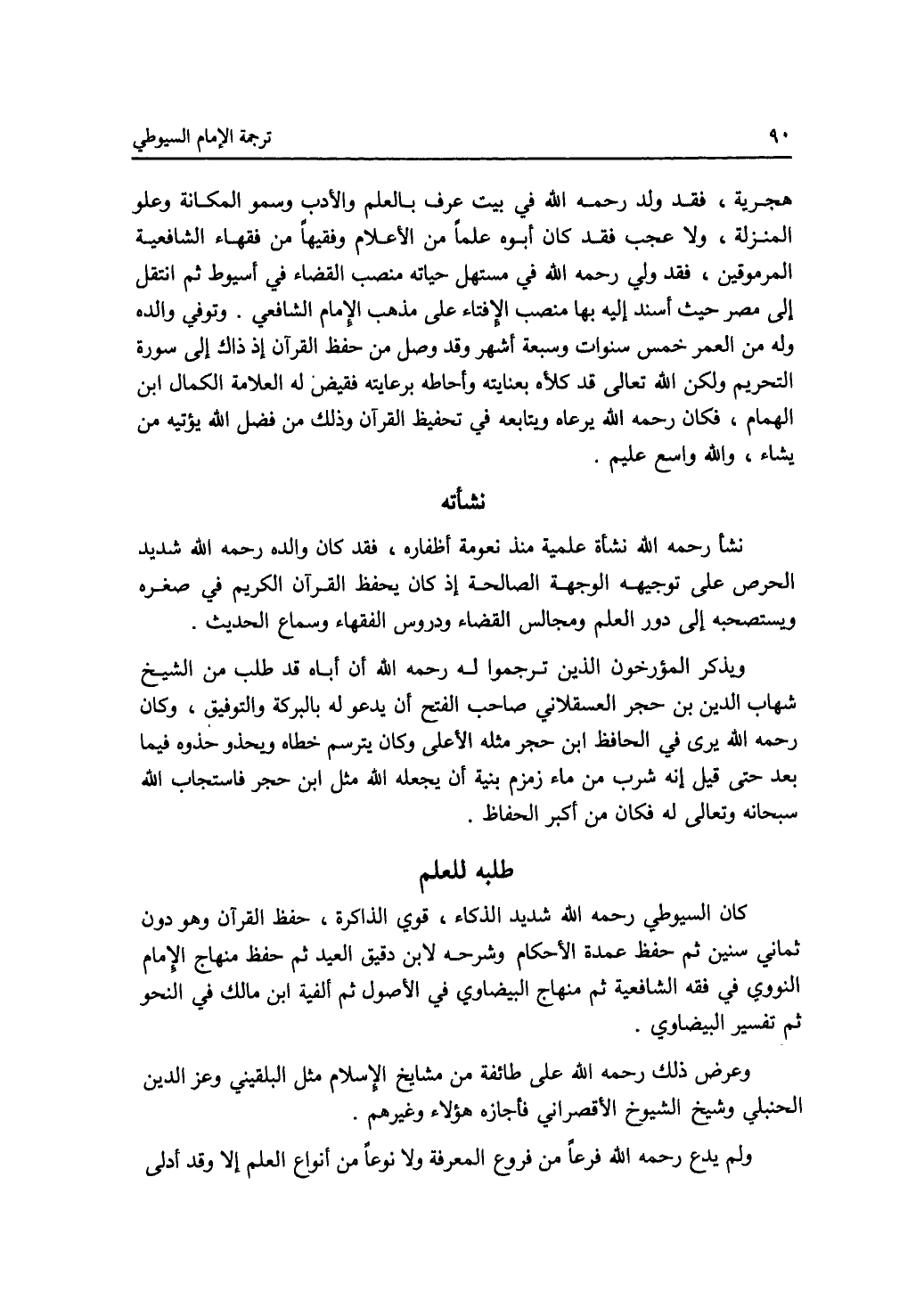 هجرية، فقد ولد رحمه الله في بيت عرف بالعلم والادب وسمو المكانة وعلو المننزلة، ولا عجب فقد كان أبوه، علما من الاعلام وفقيها من فقهاء الشافعية المرموقين، فقد ولي رحمه الله في مستهل حياته منصب القضاء في أسيوط ثم انتقل إلى مصر حيث أسند إليه بها منصب الافتاء على مذهب الامام الشافعي. وتوقي ولده وله من العمر خمس سنوات وسبعة أشهر وقد وصل من حفظ القرآن إذا ذاك إلى سورة التحريم ولكن الله تعالى قد كلاه بعنايته وأحاطه برعايته فقيض له العلامة الكمال ابن الهمام، فكان رحمه الله يرعاه ويتابعه في تحفيظ القرآن وذلك من فضل الله يؤتيه من يشاء، والله واسع عليم. نشأته نشأ رحمه الله نشأة علمية منذ نعومة أظفاره، فقد كان ولده رحمه الله شديد الحرص على توجيهه الوجهة الصالحة إذ كان يحفظ القرآن الكريم في صغره ويستصحبه إلى دور العلم ومجالس القضاء ودروس الفقهاء وسماع الحديث. ويذكر المؤرخون الذين ترجموا له رحمه الله أن أباه قد طلب من الشيخ شهاب الدين بن حجر العسقلاني صاحب الفتح أن يدعو له بالبركة والتوفيق، وكان رحمه الله يرى في الحافظ ابن حجر مثله الاعلى وكان يترسم خطاه ويحذو حذوه فيما بعد حتى قيل إنه شرب من ماء زمزم بنية أن يجعله الله مثل ابن حجر فاستجاب الله سبحانه وتعالى له فكان من أكبر الحفاظ. طلبه للعلم كان السيوطي رحمه الله شديد الذكاء، قوي الذاكرة، حفظ القرآن وهو دون ثماني سنين حفظ عمدة الاحكام وشرحه لابن دقيق العيد ثم حفظ منهاج الامام النووي في فقه الشافعية ثم منهاج البيضاوي في الاصول ثم ألفية ابن مالك في النحو ثم تفسير البيضاوي. وعرض ذلك رحمه الله على طائة من مشايخ الاسلام مثل البلقيني وعز الدين الحنبلي وشيخ الاقصراني فأجازه هؤلاء وغيرهم. ولم يدع رحمه الله من فروع المعرفة ولا نوعا من أنواع العلم إلا وقد أدلى