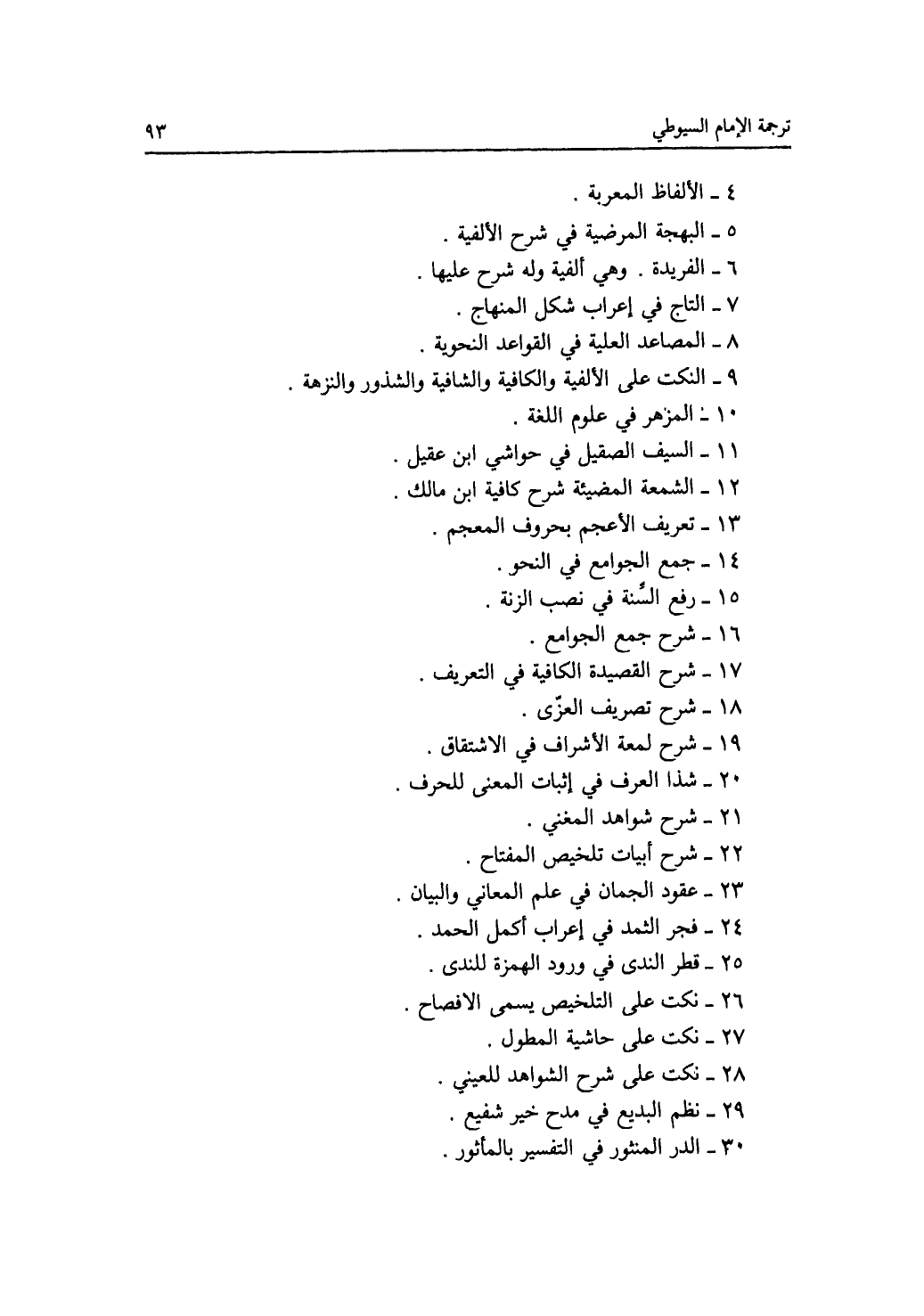 4 - الالفاظ المعربة. 5 - البهجة المرضية في شرح الالفية. 6 - الفريده. وهي ألفية وله شرح عليها. 7 - التارج في إعراب شكل المهناج. 8 - المصاعد العلية في القواعد النحوية. 9 - النكت على الالفية والشافية والشذور والنزهة. 10 - المزهر في علوم اللغة. 11 - السيف الصقيل في حواشي ابن عقيل. 12 - الشمعة المضيئة شرح كافية ابن مالك. 13 - تعريف الاعجم بحروف المعجم. 14 - جمع الجوامع في النحو. 15 - رفع السنة في نصب الزنة. 16 - شرح جمع الجوامع. 17 - شرح القصيدة الكافية في التعريف. 18 - شرح تصريف العزى. 19 - شرح لمعة الاشراف في الاشتقاق. 20 - شذا العرف في إثبات المعنى للحرب. 21 - شرح شواهد المغني. 22 - شرح أبيات تلخيص المفتاح. 23 - عقود الجمان في علم المعاني والبيان. 24 - فجر الثمد في إعراب أكمل الحمد. 25 - قطر الندى في ورود الهمزة للندى. 26 - نكت على التلخيص يسمى الافصاح. 28 - نكت على شرح الشواهد لليعني. 29 - نظم البديع في مدح خير شفيع. 30 - الدر المنثور في التفسير بالمأثور.