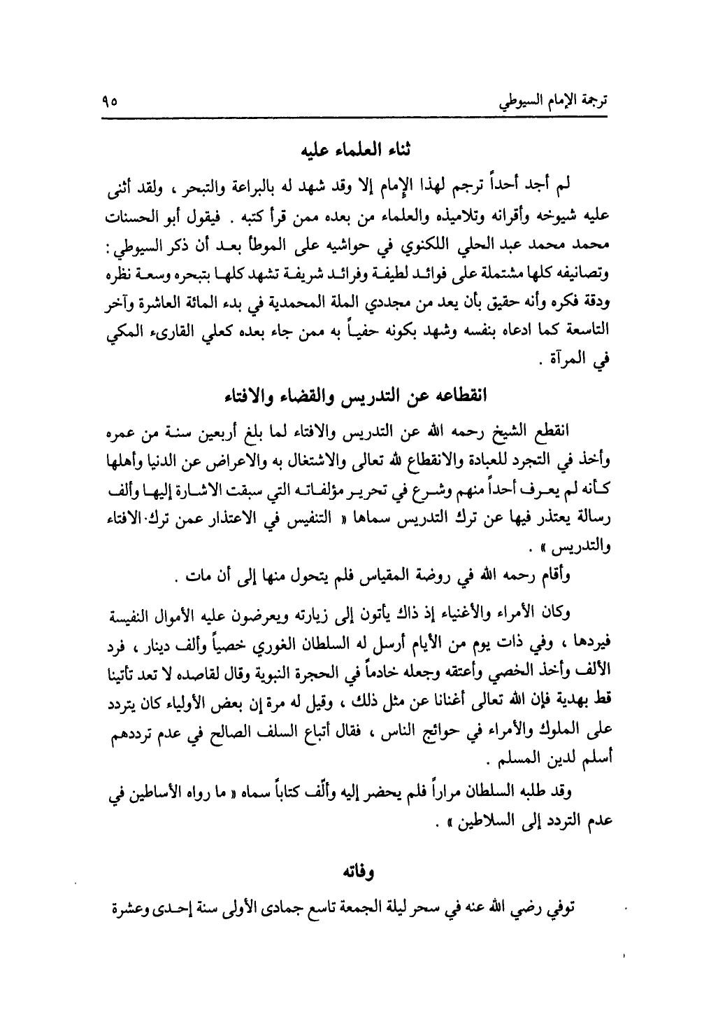 ثناء العلماء عليه لم أجد ترجم لهذا الامام إلا وقد شهد له بالبراعة والتبحر، ولقد أثنى عليه شيوخه وأقرانه وتلاميذه والعلماء من بعده ممن قرأ كتبه. فيقول أبو الحسنات محمد محمد عبد الحلي اللكنوي في حواشيه على الموطأ بعد أن ذكر السيوطي: وتصاننفه كلها مشتملة على فوائد لطيفة وفرائد شريفة تشهد كلها بتبحره وسعة نظره ودقة فكره وأنه حقيق بأن يعد من مجددي الملة المحمدية في بدء المائة العاشرة وآخر التعاسعة كما ادعاه بنفسه وشهد بكونه حفيا به ممن جاء بعده كعلي القارئ المكي في المرآة. انقطاعه عن التدريس والقضاء والافتاء انقطع الشيخ رحمه الله عن التدريس والافتاء لما بلغ أربعين سنة من عمره وأخذ في التجرد والانقطاع لله تعالى والاشتغال ووالاعراض عن الدنيا وأهلها كأنه لم يعرف أحدا منهم وشرع في تحرير مؤلفاته التي سبقت الاشارة إليها وألف رسالة يعتذر فيها عن التدريس سماها (التنفيس في الاعتذار عمن ترك الافتاء والتدريس). وأقام رحمه الل في روضه المقياس فلم يتحول منها إلى أن مات. فيردها، وفي ذات يوم من الايام أرسل له السلطان الغوري خصيا وألف دينار، فرد الالف وأخذ الخصي وأعتقه وجعله خادما في الحجرة النبوية وقال لقاصده لا تعد تأتينا قط بهدية فإن الله تعالى أغنانا عن مثل ذلك، وقيل له مرة إن بعض الاولياء كان يتردد أسلم لدين المسلم. وقد طلبه السلطان مرارا يحضر إليه وألف كتابا سماه (ما رواه الاساطين في عدم التردد إلى السلاطين.). وفاته توفي رضي الله عنه في سحر ليلة الجمعة تاسع جمادى الاولى سنة إحدى وعشرة