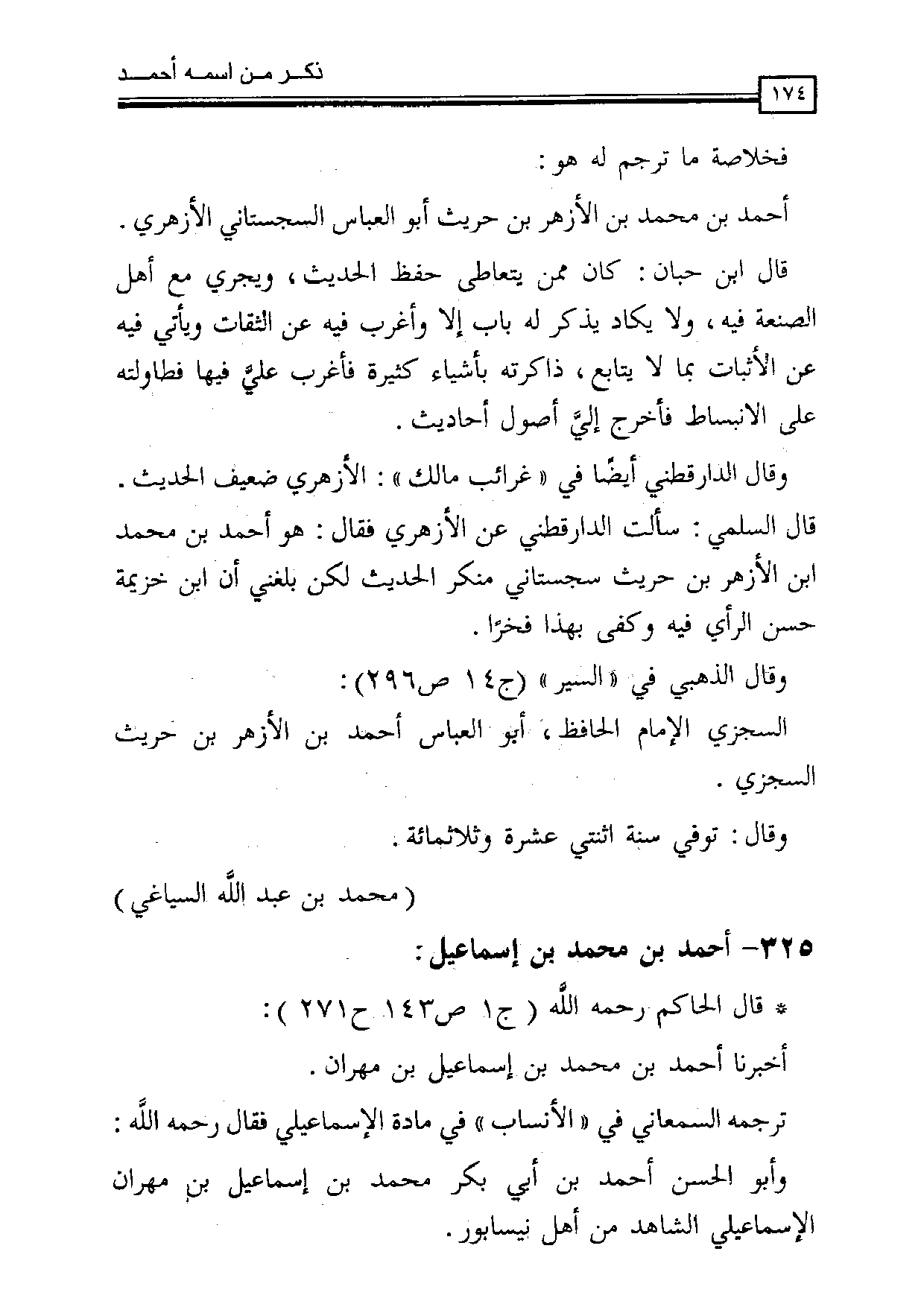 وقال الدارقطني أيضا في " غرائب مالك ": الأزهري ضعيف الحديث، قال السلمي: سألت الدارقطني عن الأزهري فقال: هو أحمد بن محمد بن الأزهر بن حريث، سجستاني، منكر الحديث لكن بلغني أن ابن خزيمة حسن الرأي فيه، وكفى بهذا فخرا.