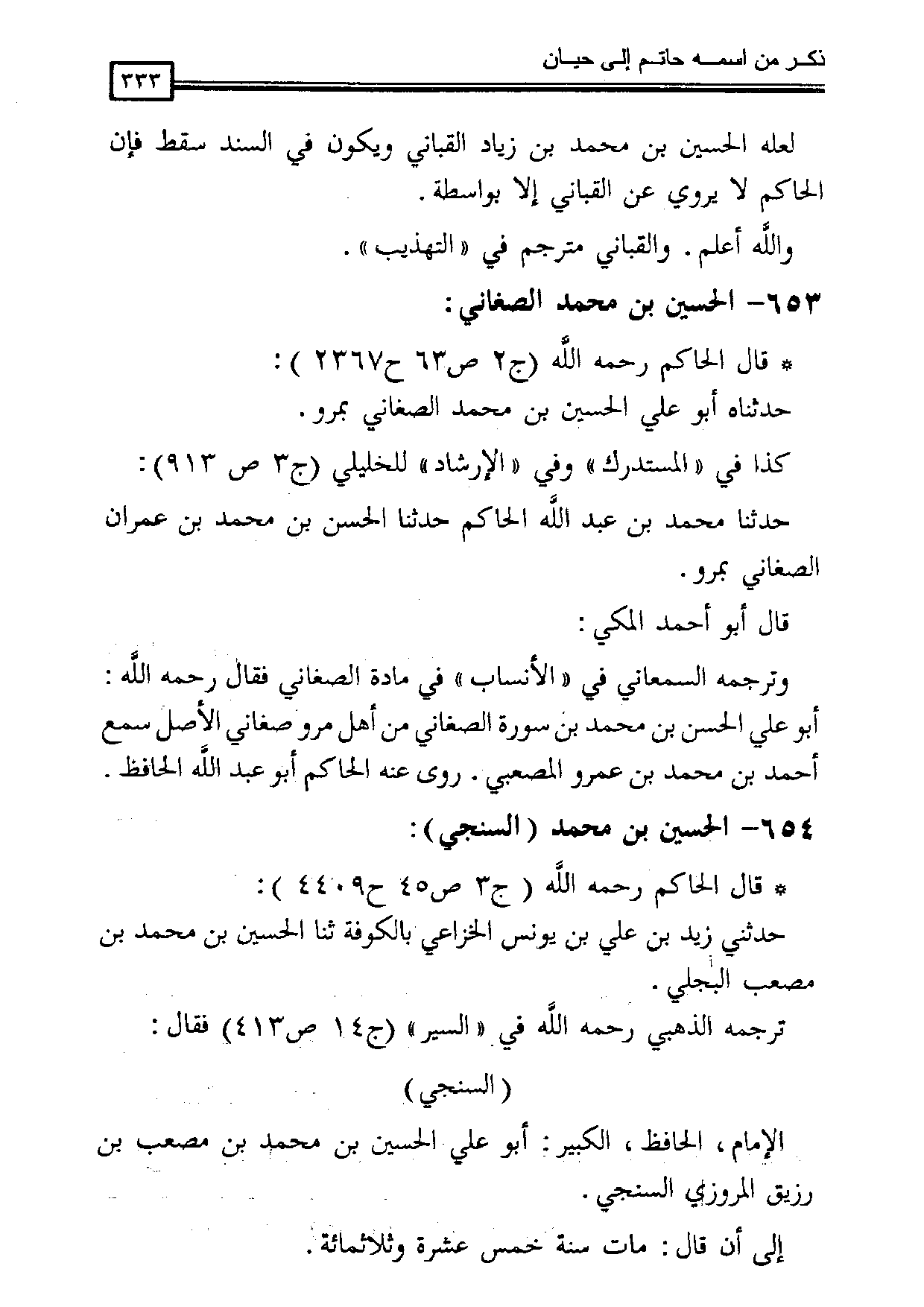 وترجمه السمعاني في " الأنساب " في مادة الصغاني فقال رحمه الله: أبو علي الحسن بن محمد بن سورة الصغاني من أهل مرو، صغاني الأصل سمع أحمد بن محمد بن عمرو المصعبي. روى عنه الحاكم أبو عبد الله الحافظ.