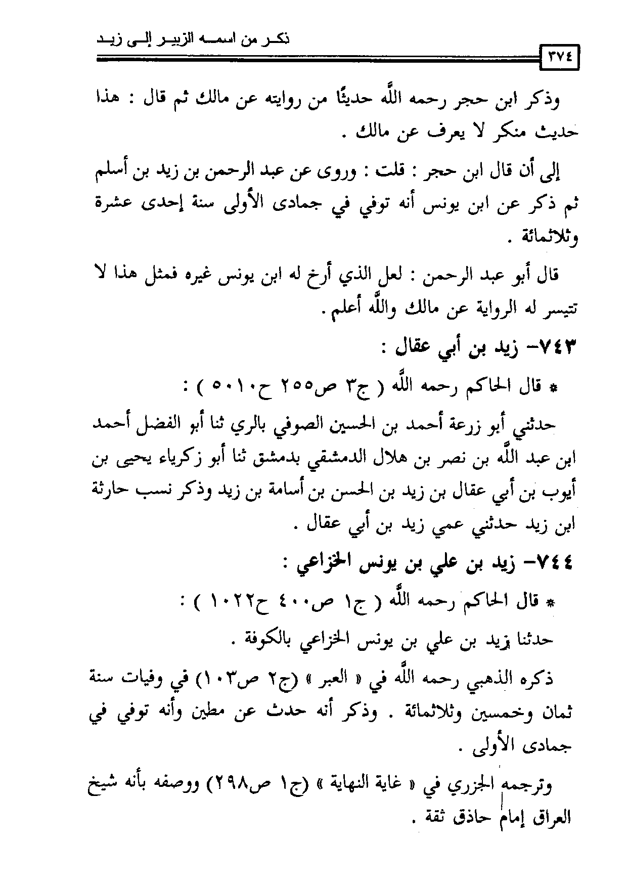 حدثني أبو زرعة أحمد بن الحسين الصوفي بالري، ثنا أبو الفضل أحمد بن عبد الله بن نصر بن هلال الدمشقي بدمشق، ثنا أبو زكرياء يحيى بن أيوب بن أبي عقال بن زيد بن الحسن بن أسامة بن زيد، وذكر نسب حارثة بن زيد، حدثني عمي زيد بن أبي عقال.