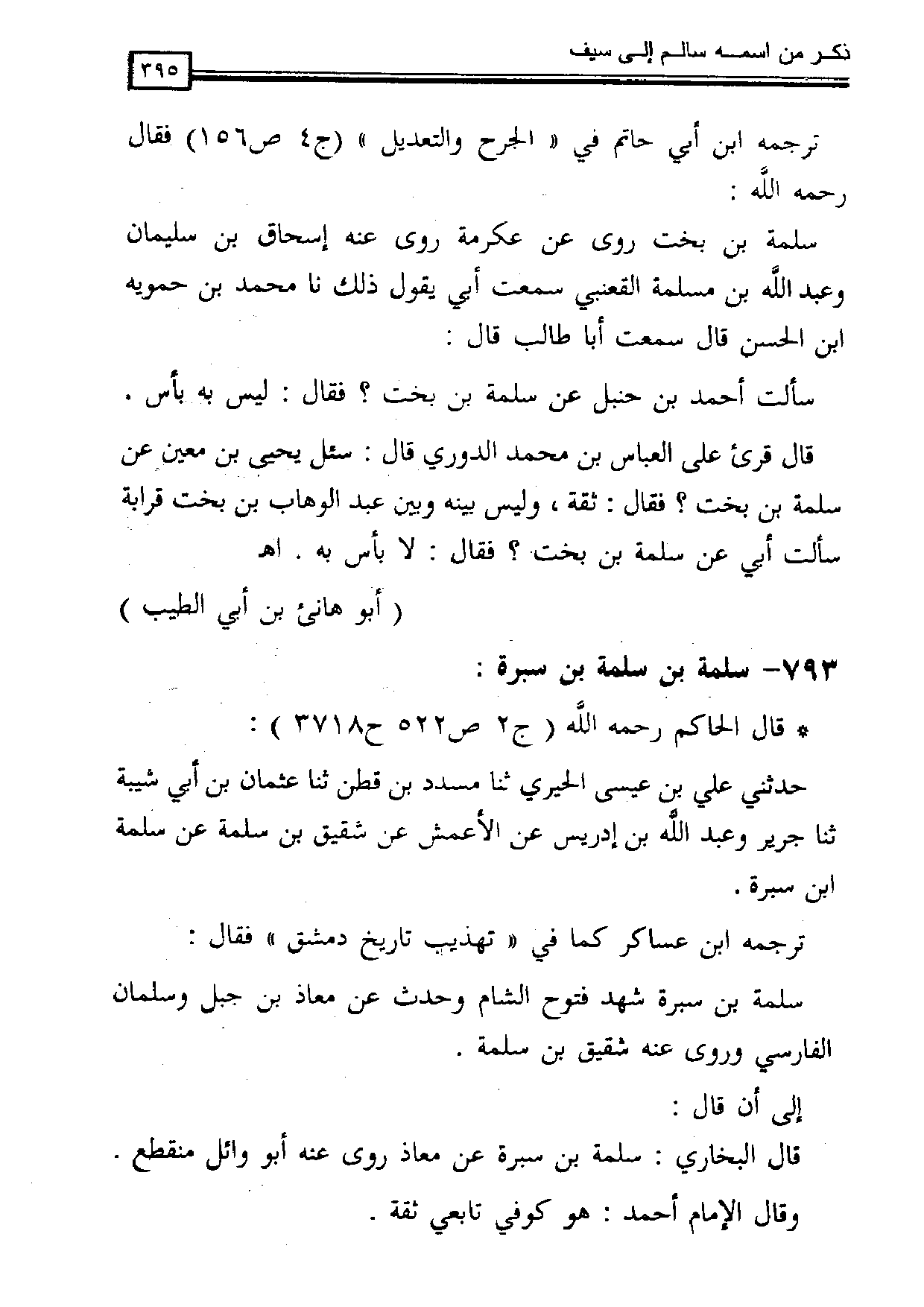 حدثني علي بن عيسى الحيري، ثنا مسدد بن قطن، ثنا عثمان بن أبي شيبة، ثنا جرير، وعبد الله بن إدريس، عن الأعمش، عن شقيق بن سلمة، عن سلمة بن سبرة.