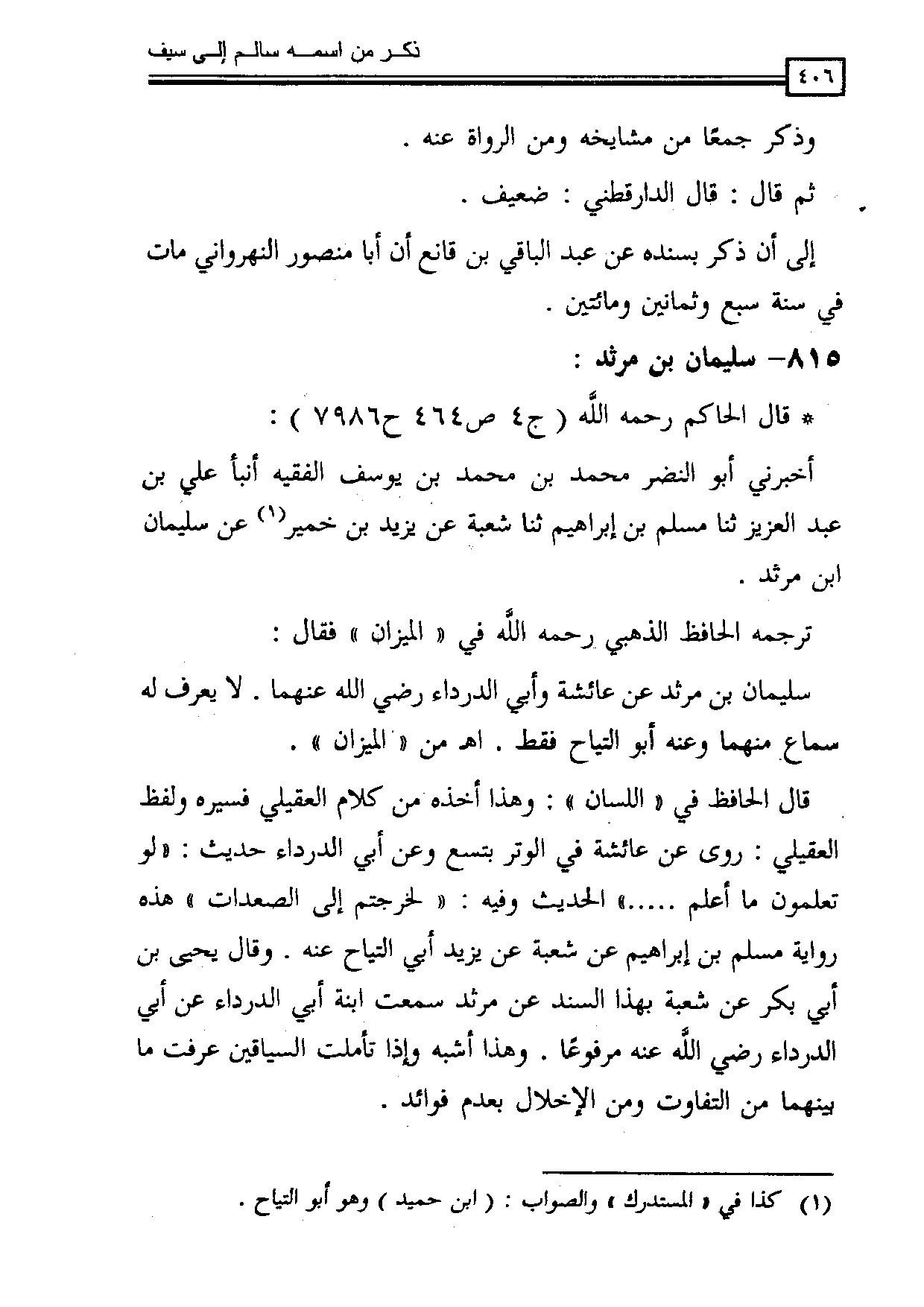 قال الحافظ في " اللسان ": وهذا ما أخذه من كلام العقيلي فسيره ولفظ العقيلي: روى عن عائشة في الوتر بتسع وعن أبي الدرداء حديث: " لو تعلمون ما أعلم. . . . . . .) الحديث وفيه: " لخرجتم إلى الصعدات " هذه رواية مسلم بن إبراهيم، عن شعبة، عن يزيد أبي التياح عنه. وقال يحيى بن أبي بكر عن شعبة بهذا السند عن مرثد سمعت ابنة أبي الدرداء، عن أبي الدرداء رضي الله عنه مرفوعا. وهذا أشبه، وإذا تأملت السياقين عرفت ما بينهما من التفاوت ومن الإخلال بعدم فوائد.