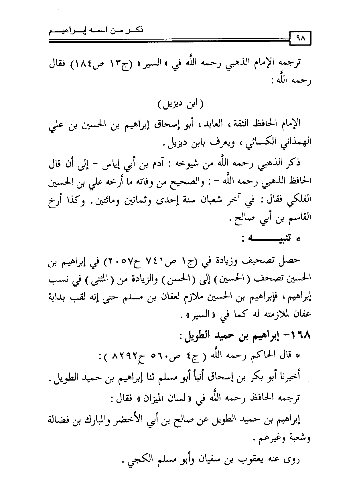 الإمام الحافظ الثقة، العابد، أبو إسحاق إبراهيم بن الحسين بن علي الهمذاني الكسائي، ويعرف بابن ديزيل.