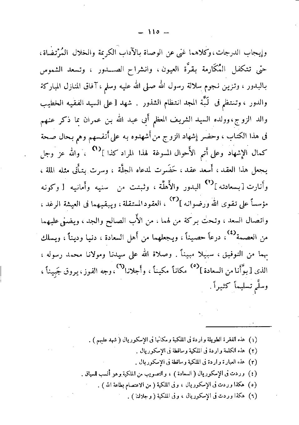 وَإِيجَاب الدَّرَجَات وَكِلَاهُمَا غَنِي عَن الوصاة بالآداب الْكَرِيمَة والخلال المرتضاة، حَتَّى تتكفل المكارمة بقرة الْعُيُون، وانشراح الصُّدُور، وتسعد الشموس بالبدور، وتزين نُجُوم سلالة رَسُول الله صلى الله عَلَيْهِ وَسلم، آفَاق الْمنَازل الْمُبَارَكَة والدور، وتنتظم فِي لبة الْمجد انتظام الشذور. شهد [على السَّيِّد الْفَقِيه الْخَطِيب وَالِد الزَّوْج، وَولده السَّيِّد الشريف الْمُعظم أبي عبد الله بن عمرَان بِمَا ذكر عَنْهُم فِي هَذَا الْكتاب، وَحضر إِشْهَاد الزَّوْج من أشهدوه بِهِ على أنفسهم وهم بِحَال صِحَة كَمَال الْإِشْهَاد وعَلى أتم الْأَحْوَال المسوغة لهَذَا المُرَاد كَذَا] ، وَالله عز وَجل يَجْعَل هَذَا العقد، أسعد عقد، حضرت لمرعاه الجلة، وسرت بتأتي مثله الْملَّة، وأنارت [بسعادته] البدور والأهلة، وَثبتت من سنيه وأمانيه [وَكَونه مؤسسا على تقوى الله ورضوانه] ، الْعُقُود المستقلة، ويبقيهما فِي العيشة الرغد، واتصال السعد، وَتَحْت بركَة من لَهما، من الْأَب الصَّالح وَالْجد، ويضفى عَلَيْهِمَا من الْعِصْمَة، درعا حصينا، ويجعلهما من أهل السَّعَادَة، دنيا ودينا، ويسلك بهما من التَّوْفِيق، سَبِيلا مُبينًا. وَصَلَاة الله على سيدنَا ومولانا مُحَمَّد رَسُوله، [الَّذِي بوأنا من السَّعَادَة] مَكَانا مكينا، وأجلانا، وَجه الْفَوْز، يروق جبينا، وَسلم تَسْلِيمًا كثيرا.
