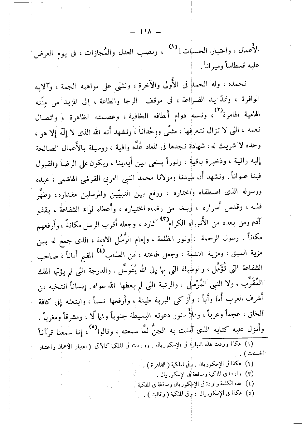 نحمده، وَله الْحَمد فِي االأولى وَالْآخِرَة، ونثني على مواهبه الجمة، وآلايه الوافرة، ونمد يَد الضراعة، فِي موقف الرجا وَالطَّاعَة، إِلَى الْمَزِيد من مننه الهامية الهامرة، ونسله دوَام ألطافه الخافية، وعصمته الظَّاهِرَة، واتصال نعمه، الَّتِي لَا تزَال نتعرفها، مثنى ووحدانا، ونشهد أَنه الله الَّذِي لَا إِلَه إِلَّا هُوَ، وَحده لَا شريك لَهُ، شَهَادَة نجدها فِي الْمعَاد عده وافية، ووسيلة بِالْأَعْمَالِ الصَّالِحَة إِلَيْهِ راقية، وذخيرة بَاقِيَة، ونورا يسْعَى بَين أَيْدِينَا، وَيكون على الرِّضَا وَالْقَبُول فِينَا عنوانا. ونشهد أَن سيدنَا ومولانا مُحَمَّد النَّبِي الْعَرَبِيّ الْقرشِي الْهَاشِمِي، عَبده وَرَسُوله الَّذِي اصطفاه وَاخْتَارَهُ، وَرفع بَين النَّبِيين وَالْمُرْسلِينَ مِقْدَاره، وطهر قلبه، وَقدس أسراره، وبلغه من رِضَاهُ اخْتِيَاره، وَأَعْطَاهُ لِوَاء الشَّفَاعَة، يقفو آدم وَمن بعده من الْأَنْبِيَاء الْكِرَام آثاره، وَجعله أقرب الرُّسُل مكانة، وأرفعهم مَكَانا. رَسُول الرَّحْمَة، وَنور الظلمَة، وَإِمَام الرُّسُل الإيمة، الَّذِي جمع لَهُ بَين مزية السَّبق، ومزية التَّتِمَّة، وَجعل طَاعَته، من الْعَذَاب الْمُقِيم أَمَانًا، صَاحب الشَّفَاعَة الَّتِي تؤمل، والوسيلة الَّتِي بهَا إِلَى الله يتوسل، والدرجة الَّتِي لم يؤتها ملك المقرب، وَلَا النَّبِي الْمُرْسل، والرتبة الَّتِي لم يُعْطهَا الله سواهُ. إنْسَانا انتخبه من أشرف الْعَرَب أما وَأَبا، وأزكى الْبَريَّة طِينَة، وأرفعها نسبا، وابتعثه إِلَى كَافَّة الْخلق، عجما وعربا، وملأ بِنور دَعوته البسيطة جنوبا وَشمَالًا، ومشرقا ومغربا، وَأنزل عَلَيْهِ كِتَابه الَّذِي آمَنت بِهِ الْجِنّ لما سمعته، وَقَالُوا، إِنَّا سمعنَا قُرْآنًا