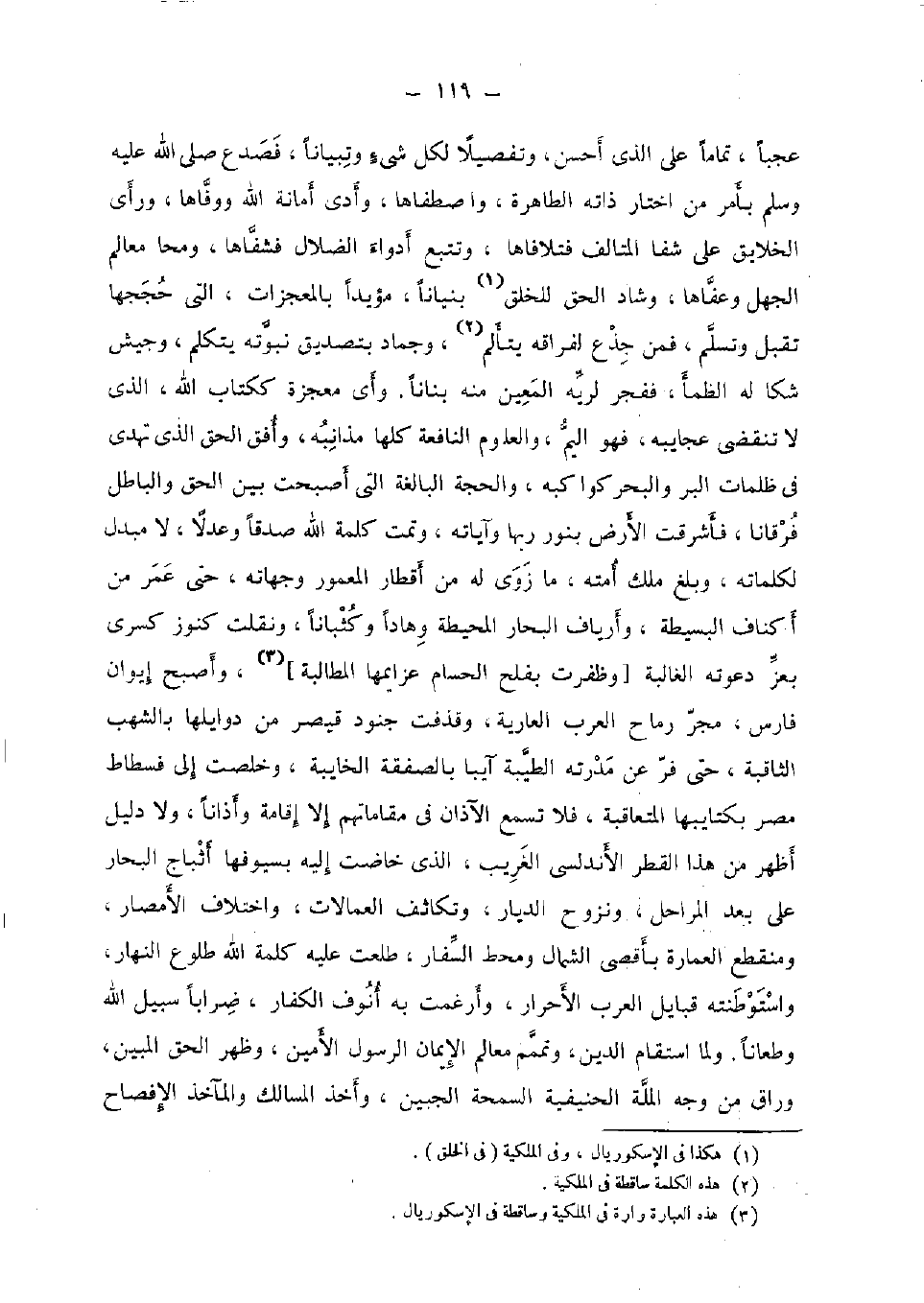 عجبا، تَمامًا على الَّذِي أحسن، وتفصيلا لكل شئ وتبيانا، فصدع صلى الله عَلَيْهِ وَسلم بِأَمْر من اخْتَار ذَاته الطاهرة، واصطفاها، وَأدّى أَمَانَة الله ووفاها، وَرَأى الخلايق على شفا المتالف فتلافاها، وتتبع أدواء الضلال فشفاها، ومحا معالم الْجَهْل وعفاها، وشاد الْحق لِلْخلقِ بنيانا، مؤيدا بالمعجزات، الَّتِي حججها تقبل وتسلم، فَمن جذع لفراقه يتألم، وجماد بِتَصْدِيق نبوته يتَكَلَّم، وجيش شكا لَهُ الظمأ، ففجر لريه الْمعِين مِنْهُ بنانا. وَأي معْجزَة ككتاب الله، الَّذِي لَا تَنْقَضِي عجايبه، فَهُوَ اليم، والعلوم النافعة كلهَا مذانبة، وأفق الْحق الَّذِي تهدي فِي ظلمات الْبر وَالْبَحْر كواكبه، وَالْحجّة الْبَالِغَة الَّتِي أَصبَحت بَين الْحق وَالْبَاطِل فرقانا، فأشرقت الأَرْض بِنور رَبهَا وآياته، وتمت كلمة الله صدقا وعدلا، لَا مبدل لكلماته، وَبلغ ملك أمته، مَا زوى لَهُ من أقطار الْمَعْمُور وجهاته، حَتَّى عمر من أكناف البسيطة، وأرياف الْبحار المحيطة وهادا وكثبانا، ونقلت كنوز كسْرَى بعز دَعوته الْغَالِبَة [وظفرت بفلح الحسام عزايمها الْمُطَالبَة] ، وَأصْبح إيوَان فَارس، مجر رماح الْعَرَب الْعَارِية، وقذفت جنود قَيْصر من دواليها بِالشُّهُبِ الثاقبة، حَتَّى فر عَن مدرته الطّيبَة آيبا بالصفقة الخايبة، وخلصت إِلَى فسطاط مصر بكتايبها المتعاقبة، فَلَا تسمع الآذان فِي مقاماتهم إِلَّا إِقَامَة وأذانا، وَلَا دَلِيل أظهر من هَذَا الْقطر الأندلسي الْغَرِيب، الَّذِي خاضت إِلَيْهِ بسيوفها أثباج الْبحار على بعد المراحل، ونزوح الديار، وتكاثف العمالات، وَاخْتِلَاف الْأَمْصَار، ومنقطع الْعِمَارَة بأقصى الشمَال ومحط السفار، طلعت عَلَيْهِ كلمة الله طُلُوع النَّهَار، واستوطنته قبايل الْعَرَب الْأَحْرَار، وأرغمت بِهِ أنوف الْكفَّار، ضرابا سَبِيل الله وطعانا. وَلما استقام الدّين، وتمم معالم الْإِيمَان الرَّسُول الْأمين، وَظهر الْحق الْمُبين، وراق من وَجه الْملَّة الحنيفية السمحة الجبين، وَأخذ المسالك والمآخذ والإفصاح