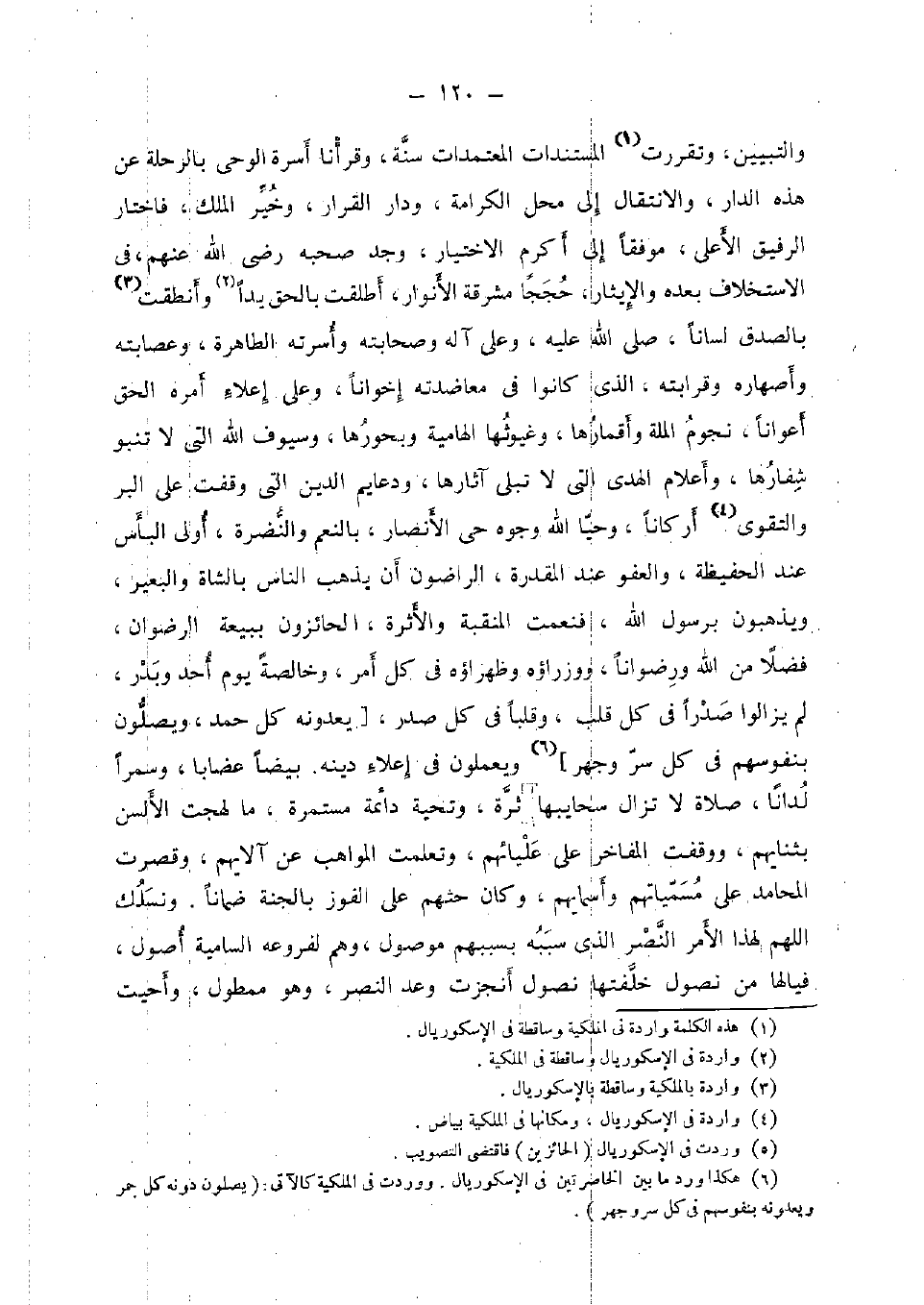 والتبيين وتقررت المستندات المعتمدات سنة، وقرأنا أسرة الْوَحْي بالرحلة عَن هَذِه الدَّار، والانتقال إِلَى مَحل الْكَرَامَة، وَدَار الْقَرار، وَخير الْملك، فَاخْتَارَ الرفيق الْأَعْلَى، موفقا إِلَى أكْرم الِاخْتِيَار، وجد صَحبه رَضِي الله عَنْهُم، فِي الِاسْتِخْلَاف بعده والإيثار، حجَجًا مشرقة الْأَنْوَار، أطلقت بِالْحَقِّ يدا وأنطقت بِالصّدقِ لِسَانا، صلى الله عَلَيْهِ، وعَلى آله وصحابته وأسرته الطاهرة، وعصابته وأصهاره، وقرابته، الَّذِي كَانُوا فِي معاضدته إخْوَانًا، وعَلى إعلاء أمره الْحق أعوانا، نُجُوم الْملَّة وأقمارها، وغيوثها الهامية وبحورها، وسيوف الله الَّتِي لَا تنبو شفارها، وأعلام الْهدى الَّتِي لَا تبلى آثارها، ودعايم الدّين الَّتِي وقفت على الْبر وَالتَّقوى أركانا، وَحيا الله وُجُوه حى الْأَنْصَار، بِالنعَم والنضرة، أولي الْبَأْس عِنْد الحفيظة، وَالْعَفو عِنْد الْمقدرَة، الرضْوَان أَن يذهب النَّاس بِالشَّاة وَالْبَعِير، ويذهبون برَسُول الله، فنعمت المنقبة والأثرة، الحائزون ببيعة الرضْوَان، فضلا من الله ورضوانا، ووزراؤه وظهراؤه فِي كل أَمر، وخالصة يَوْم أحد وَبدر، لم يزَالُوا صَدرا فِي كل قلب، وَقَلْبًا فِي كل صدر، [يعدونه كل حمد، وَيصلونَ بنفوسهم فِي كل سر وجهر] ويعملون فِي إعلاء دينه. بيضًا عضابا، وسمرا لدانا، صَلَاة لَا تزَال سحايبها ثرة، وتحية دائمة مستمرة، مَا لهجت الألسن بثنايهم، ووقفت المفاخر على عليائهم، وتعلمت الْمَوَاهِب على آلايهم، وَقصرت المحامد على مسمياتهم وأسمايهم، وَكَانَ حثهم على الْفَوْز بِالْجنَّةِ ضمانا. ونسلك اللَّهُمَّ لهَذَا الْأَمر النَّصْر الَّذِي سَببه بسببهم مَوْصُول، وهم لفروعه السامية أصُول، فيا لَهَا من نصول خلفتها نصول أنجزت وعد النَّصْر، وَهُوَ ممطول، وأحيت