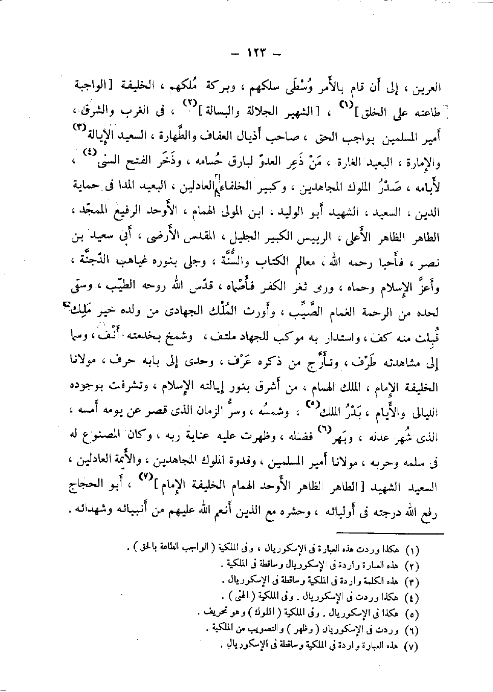 العرين، إِلَى أَن قَامَ بِالْأَمر وسطى سلكهم، وبركة ملكهم، الْخَلِيفَة [الْوَاجِبَة طَاعَته على الْخلق] ، [الشهير الْجَلالَة والبسالة] فِي الغرب والشرق، أَمِير الْمُسلمين بِوَاجِب الْحق، صَاحب أذيال العفاف وَالطَّهَارَة، السعيد الإيالة والإمارة، الْبعيد الْغَارة، من ذعر الْعَدو لبارق حسامه، وَذخر الْفَتْح السّني، لأيامه، صدر الْمُلُوك الْمُجَاهدين، وكبير الْخُلَفَاء العادلين، الْبعيد المدا فِي حماية الدّين، السعيد، الشَّهِيد أَبُو الْوَلِيد، ابْن الْمولى الْهمام، الأوحد الرفيع الممجد، الطَّاهِر الظَّاهِر الْأَعْلَى الرييس الْكَبِير الْجَلِيل، الْمُقَدّس الأرضي، أبي سعيد بن نصر، فأحيا رَحمَه الله، معالم الْكتاب وَالسّنة، وجلى بنوره غياهب الدجنة، وأعز الْإِسْلَام وحماه، وَرمى ثغر الْكفْر فأصماه، قدس الله روحه الطّيب وَسَقَى لحده من الرَّحْمَة والغمام الصيب، وأورث الْملك الجهادي من وَلَده خير ملك قبلت مِنْهُ كف، واستدار بِهِ موكب للْجِهَاد ملتف، وشمخ بخدمته أنف، وسما إِلَى مشاهدته طرف، وتأرج من ذكره عرف، وحدي إِلَى بَابه حرف، مَوْلَانَا الْخَلِيفَة الإِمَام، الْملك الْهمام، من أشرق بِنور إيالته الْإِسْلَام، وتشرفت بِوُجُودِهِ اللَّيَالِي والايام، بدر الْملك، وشمسه وسر الزَّمَان الَّذِي قصر عَن يَوْمه أمسه، الَّذِي شهر عدله، وبهر فَضله، وَظَهَرت عَلَيْهِ عناية ربه، وَكَانَ الْمَصْنُوع لَهُ فِي سلمه وحربه، مَوْلَانَا أَمِير الْمُسلمين، وقدوة الْمُلُوك الْمُجَاهدين، وَالْأَيمَة العادلين، السعيد الشَّهِيد [الطَّاهِر الظَّاهِر الأوحد الْهمام الْخَلِيفَة الإِمَام] ، أَبُو الْحجَّاج رفع الله درجتة فِي أوليائه، وحشره مَعَ الَّذين أنعم الله عَلَيْهِم من أنبيائه وشهدائه