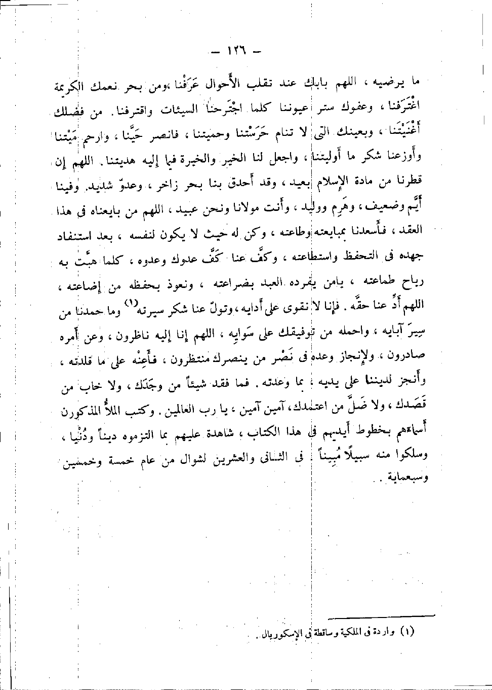 مَا يرضيه، اللَّهُمَّ بابك عِنْد تقلب الْأَحْوَال عرفنَا، وَمن بَحر نعمك الْكَرِيمَة اغترفنا، وعفوك ستر عيوننا كلما اجترحنا السَّيِّئَات واقترفنا. من فضلك أغنيتنا، وبعينك الَّتِي لَا تنام حرستنا وحميتنا، فانصر حينا، وَارْحَمْ ميتنا وأوزعنا شكر مَا أوليتنا، وَاجعَل لنا الْخَيْر والخيرة فِيمَا إِلَيْهِ هديتنا. اللَّهُمَّ إِن قطرنا من مَادَّة الْإِسْلَام بعيد، وَقد أحدق بِنَا بَحر زاخر، وعدو شَدِيد. وَفينَا أيم وَضَعِيف، وهرم ووليد، وَأَنت مَوْلَانَا وَنحن عبيد، اللَّهُمَّ من بَايَعْنَاهُ فِي هَذَا العقد، فأسعدنا بمبايعته وطاعته، وَكن لَهُ حَيْثُ لَا يكون لنَفسِهِ، بعد استنفاد جهده فِي التحفظ واستطاعته، وكف عَنَّا كف عَدوك وعدوه، كلما هبت بِهِ ريَاح طماعته، يَا من يفرده العَبْد بضراعته، ونعوذ بحفظه من إضاعته، اللَّهُمَّ أد عَنَّا حَقه. فَإنَّا لَا نقوى على أدايه، وتول عَنَّا شكر سيرته وَمَا حمدنا من سير آبايه، واحمله من توفيقك على سوايه، اللَّهُمَّ إِنَّا إِلَيْهِ ناظرون، وَعَن أمره صادرون، ولإنجاز وعده فِي نصر من ينصرك منتظرون، فأعنه على مَا قلدته، وأنجز لديننا على يَدَيْهِ، بِمَا وعدته. فَمَا فقد شَيْئا من وَجدك، وَلَا خَابَ من قصدك، وَلَا ضل من اعتمدك، آمين آمين، يَا رب الْعَالمين. وَكتب الْمَلأ المذكورن أَسْمَاءَهُم بخطوط أَيْديهم فِي هَذَا الْكتاب، شاهدة عَلَيْهِم بِمَا التزموه دينا وَدُنْيا، وسلكوا مِنْهُ سَبِيلا مُبينًا. فِي الثَّانِي وَالْعِشْرين لشوال من عَام خَمْسَة وَخمسين وسبعماية.