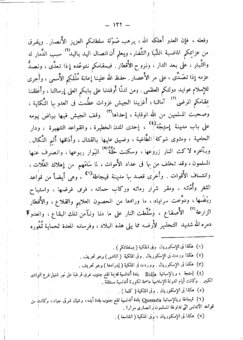 وَفعله، فَإِن الْعَدو أهلكه الله، يرهب صولة سلطانكم الْعَزِيز الْأَنْصَار. وَيفرق من عزايمكم الْمَاضِيَة الشبا والشفار، وَيعلم أَن اتِّصَال الْيَد بِالْيَدِ سَبَب الدمار لَهُ والثبار، على بعد الدَّار، ونزوح الأقطار. فبمقامكم نتوعده إِذا تعدى، نصد عزمه إِذا تصدى، على مر الْأَعْصَار. حفظ الله علينا إِعَانَة مللكم الأسمى، وأجرى لِلْإِسْلَامِ عوايد دولتكم الْعُظْمَى. وَمن لدنا أوفدنا على بَابَكُمْ الْعلي إرسالنا، وأعلقنا بمقامكم المرضى آمالنا؛ أغزينا الْجَيْش غزوات عظمت فِي الْعَدو بهَا النكاية، وصحبت الْمُسلمين من الله الْوِقَايَة، إِحْدَاهَا وقف الْجَيْش فِيهَا بَيَاض يَوْمه على بَاب مَدِينَة إستجة، إِحْدَى المدن الخطيرة، وَالْقَوَاعِد الشهيرة، وَدَار الحامية، ومثوى شَوْكَة الطاغية، وضيق عَلَيْهَا بِالْقِتَالِ، وأذاقها أَلِيم النكال. وبآخره لاكت النَّار زروعها، وسكنت حلَّة الْبَوَار ربوعها، وَانْصَرف عَنْهَا الْمُسلمُونَ، وَقد تخلف من بهَا فِي عداد الْأَمْوَات، لما سامهم من إهلاك الغلات، وانتساف الأقوات. وَأُخْرَى قصد بهَا مَدِينَة قيجاطة، وَهِي أَيْضا من قَوَاعِد الثغر وأماته، ومقر شرار رماته وركاب حماته، فَرمى غرضها، واستباح ربضها، ودوخت سراياه، مَا وَرَاءَهَا من الْحُصُون العلايم والقلاع، والأقطار الزارعة الأصقاع، وسلطت النَّار على مَا دنا ونآ من تِلْكَ الْبِقَاع، والعدو دمره الله شَدِيد التحذير لأرضه مِمَّا يَلِي هَذِه الْبِلَاد، وفرسانه الْمعدة لحماية ثغوره