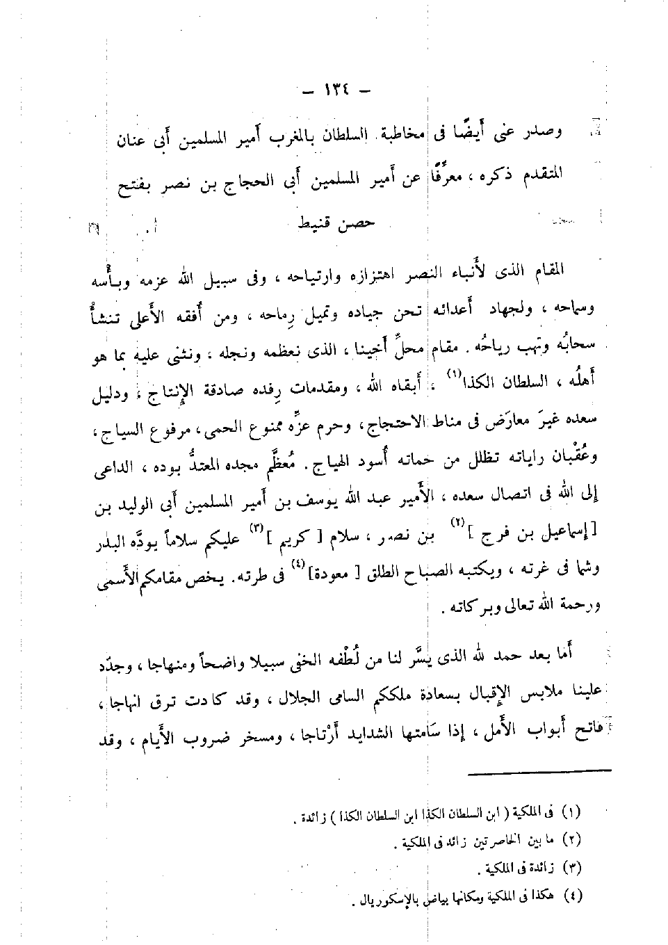 وَصدر عني أَيْضا فِي مُخَاطبَة السُّلْطَان بالمغرب أَمِير الْمُسلمين أبي عنان الْمُتَقَدّم ذكره، مُعَرفا عَن أَمِير الْمُسلمين أبي الْحجَّاج بن نصر بِفَتْح حصن قنيط
