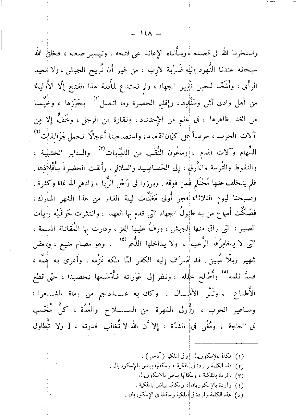 واستخرنا الله فِي قَصده، وسألناه الْإِعَانَة على فَتحه، وتيسير صعبه، فخلق الله سُبْحَانَهُ عندنَا النهود إِلَيْهِ ضَرْبَة لازب، من غير أَن نريح الْجَيْش، وَلَا نعيد الرَّأْي وأشعنا للحين نفير الْجِهَاد، وَلم نستدع لمأدبة هَذَا الْفَتْح إِلَّا الْأَوْلِيَاء من أهل وَادي آش وسندها، وأقليم الحضرة وَمَا اتَّصل بحوزها، وخيمنا من الْغَد بظاهرها، فِي عَفْو من الإحتشاد، ونقاوة من الرجل، وخف إِلَّا من آلَات الْحَرْب، حرصا على كتمان الْقَصْد، واستصحبنا أعجالا تحمل جوالقات السِّهَام وآلات الْهدم، وماعون النقب من الدبابات والستاير الخشبية، والنفوط والترسة والدرق، إِلَى الحصاصيد والسلالم، وَأَلْقَتْ الحضرة بأفلاذها. فَلم يتَخَلَّف عَنْهَا محتلم فَمن فَوْقه. وبرزوا فِي رَحل الرِّبَا، زادهم الله نَمَاء وَكَثْرَة. وصبحنا ليَوْم الثُّلَاثَاء فجر أولى مظنات لَيْلَة الْقدر من هَذَا الشَّهْر الْمُبَارك، فصكت أسماع من بِهِ طبول الْجِهَاد الَّتِي قدم بهَا الْعَهْد، وانتثرت حواليه رايات الصَّبْر، الَّتِي راق مِنْهَا الْجَيْش، ورف عَلَيْهَا الغر، ودارت بهَا الْمُقَاتلَة الْمسلمَة، الَّتِي لَا يخامرها الرعب، وَلَا يداخلها الذعر، وَهُوَ مصام منيع، وَمَعْقِل شهير وَبلا مُبين. قد صرف إِلَيْهِ الْكفْر لما ملكه عزمه، وأغرى بِهِ همه، فسد ثلمه وَأصْلح خلله وَنظر إِلَى عوراته فأوسعها تحصينا، حَتَّى قطع الأطماع، وتبر الآمال. وَكَانَ بِهِ عدد جم من رُمَاة الشعرا، ومساعير الْحَرْب، وَأولى الشُّهْرَة من السِّلَاح وَالْعدة، كل محسب فِي الْحَاجة، ومغن فِي الشدَّة، إِلَّا أَن الله لَا تغالب قدرته، [وَلَا تطاول