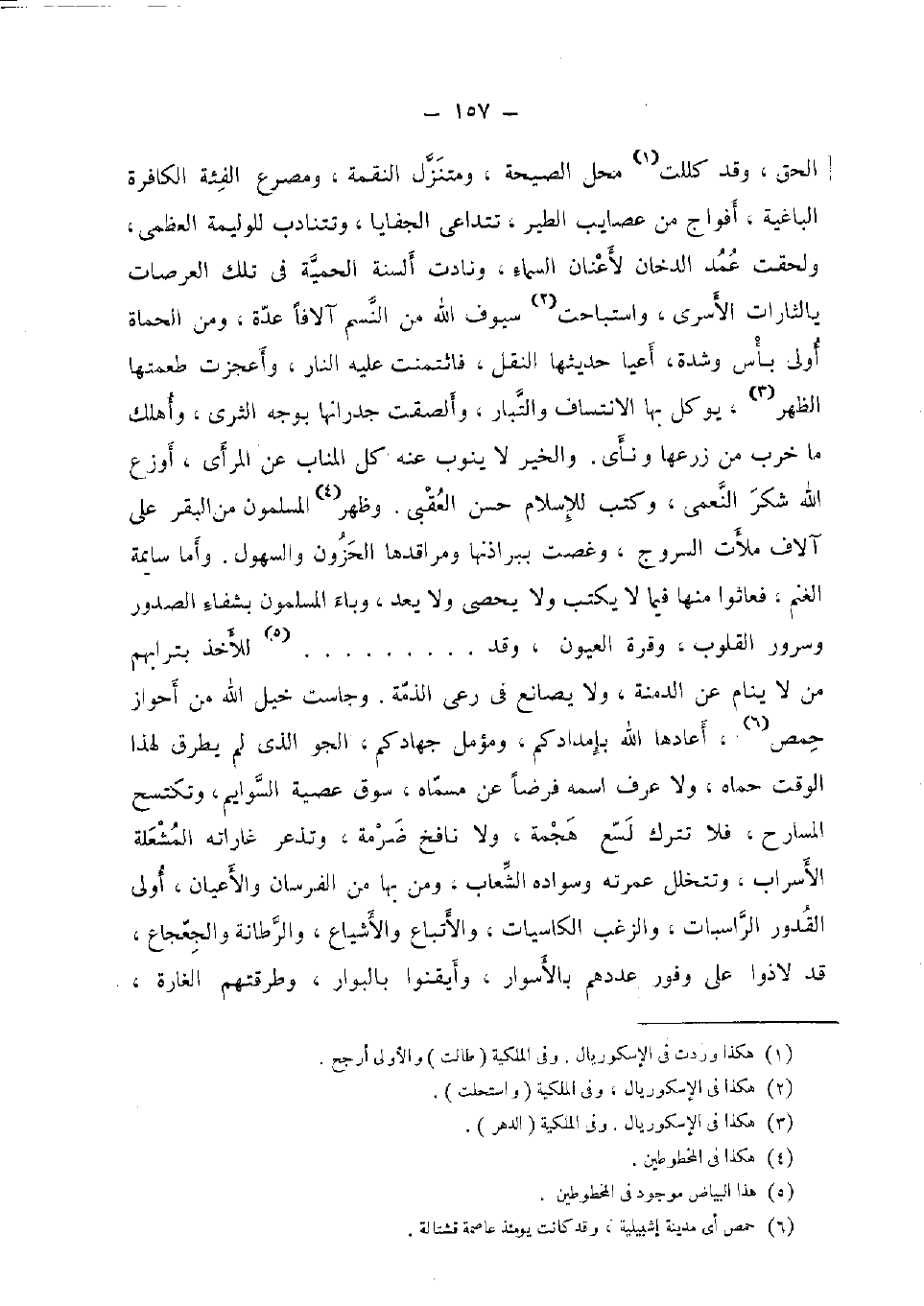 الْحق، وَقد كللت مَحل الصَّيْحَة، ومتنزل النقمَة، ومصرع الفئة الْكَافِرَة الباغية، أَفْوَاج من عصايب الطير، تتداعى الجفايا، وتتنادب للوليمة الْعُظْمَى، وَلَحِقت عمد الدُّخان لأعنان السَّمَاء، وَنَادَتْ أَلْسِنَة الحمية فِي تِلْكَ العرصات يالثارات الأسرى، واستباحت سيوف الله من النسم آلافا عدَّة، وَمن الحماة أولى بَأْس وَشدَّة، أعيا حَدِيثهَا النَّقْل، فاثتمنت علية النَّار، وأعجزت طعمتها الظّهْر، يُوكل بهَا الانتساف والتبار، وألصقت جدرانها بِوَجْه الثرى، وَأهْلك مَا خرب من زَرعهَا ونأى. وَالْخَيْر لَا يَنُوب عنة كل المناب عَن المرأى، أوزع الله شكر النعمى، وَكتب لِلْإِسْلَامِ حسن العقبى. وَظهر الْمُسلمُونَ من الْبَقر على آلَاف مَلَأت السُّرُوج، وغصت ببراذنها ومراقدها الحزون والسهول. وَأما سايمة الْغنم، فعاثوا مِنْهَا فِيمَا لَا يكْتب وَلَا يُحْصى وَلَا يعد، وباء الْمُسلمُونَ بشفاء الصُّدُور وسرور الْقُلُوب، وقرة الْعُيُون، وَقد ... ... ... . . للأخذ بترابهم من لَا ينَام عَن الدمنة ن وَلَا يصانع فِي رعى الذِّمَّة. وجاست خيل الله من أحواز حمص، أَعَادَهَا الله بإمدادكم، ومؤمل جهادكم، الجو الَّذِي لم يطْرق لهَذَا الْوَقْت حماه، وَلَا عرف اسْمه فرضا عَن مُسَمَّاهُ، سوق عصية السوايم وتكتسح المسارح، فَلَا تتْرك لسع هجمة، وَلَا نافخ ضرمة، وتذعر غاراته المشعلة الأسراب، وتتخلل عمرته وسواده الشعاب، وَمن بهَا من الفرسان والأعيان، أولى الْقُدُور الراسبات، والزغب الكاسيات، والأتباع والأشياع، والرطانة والجعجاع، قد لاذوا على وفور عَددهمْ بالأسوار، وأيقنوا بالبوار، وطرقتهم الْغَارة،
