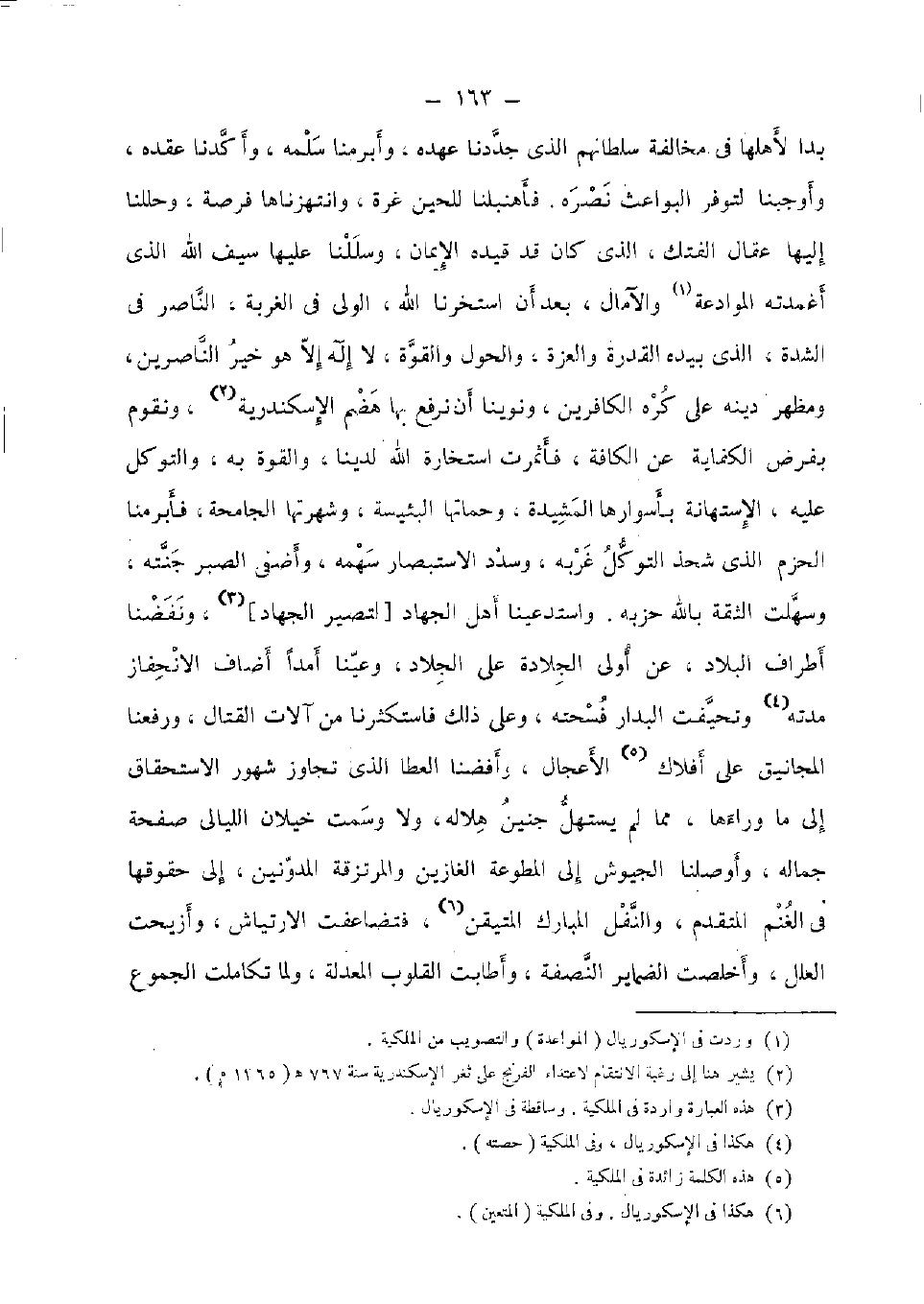 بدا لأَهْلهَا فِي مُخَالفَة سلطانهم الَّذِي جددنا عَهده، وأبرمنا سلمه، وأكدنا عقده، وأوجبنا لتوفر البواعث نَصره. فأهنبلنا للحين غرَّة، وانتهزناها فرْصَة، وحللنا إِلَيْهَا عقال الفتك، الَّذِي كَانَ قد قَيده الْإِيمَان، وسللنا عَلَيْهَا سيف الله الَّذِي أغمدته الْمُوَادَعَة والآمال، بعد أَن استخرنا الله، الْوَلِيّ فِي الغربة، النَّاصِر فِي الشدَّة، الَّذِي بِيَدِهِ الْقُدْرَة والعزة، والحول وَالْقُوَّة، لَا إِلَه إِلَّا هُوَ خير الناصرين، ومظهر دينه على كره الْكَافرين، ونوينا أَن نرفع بهَا هضم الْإسْكَنْدَريَّة، ونقوم بِفَرْض الْكِفَايَة عَن الكافة، فأثمرت استخارة الله لدينا، وَالْقُوَّة بِهِ، والتوكل عَلَيْهِ، الإستهانة بأسوارها المشيدة، وحماتها البئيسة، وشهرتها الجامحة، فأبرمنا الحزم الَّذِي شحذ التَّوَكُّل غربه، وسدد الاستبصار سَهْمه، وأضفى الصَّبْر جنته، وسهلت الثِّقَة بِاللَّه حزبه. واستدعينا أهل الْجِهَاد [لتصير الْجِهَاد] ، ونفضنا أَطْرَاف الْبِلَاد، عَن أولى الجلادة على الجلاد، وعينا أمدا أضَاف الانحفاز مدَّته وتحيفت البدار فسحته، وعَلى ذَلِك فاستكثرنا من آلَات الْقِتَال، ورفعنا المجانيق على أفلاك الأعجال، وأفضنا العطا الَّذِي تجَاوز شهور الأستحقاق إِلَى مَا وَرَاءَهَا، مِمَّا لم يستهل جَنِين هلاله، وَلَا وسمت خيلان اللَّيَالِي صفحة جماله، وأوصلنا الجيوش إِلَى المطوعة الغازين والمرتزقة المدونين إِلَى حُقُوقهَا فِي الْغنم الْمُتَقَدّم، وَالنَّفْل الْمُبَارك الْمُتَيَقن، فتضاعفت الارتياش، وأزيحت الْعِلَل، وأخلصت الضماير النصفة، وأطابت الْقُلُوب المعدلة، وَلما تكاملت الجموع