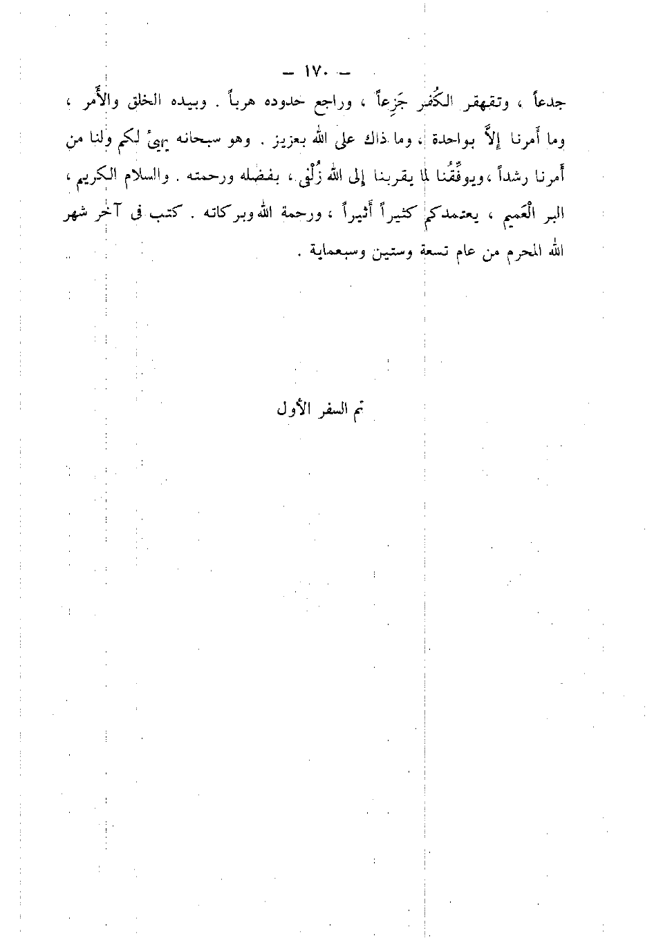 جدعا , وتقهقر الْكفْر جزعا , وراجع حُدُوده هربا. وَبِيَدِهِ الْخلق وَالْأَمر , وَمَا أمرنَا إِلَّا بِوَاحِدَة , وَمَا ذالك على الله بعزيز , وَهُوَ سُبْحَانَهُ يهيء لكم وَلنَا من أمرنَا رشدا , ويوفقنا كَمَا يقربنا الله زلفى , بفضله وَرَحمته. وَالسَّلَام الْكَرِيم , الْبر العميم , يعْتَمد كم كثيرا أثيرا , وَرَحْمَة الله وَبَرَكَاته. كتب فى آخر شهر الله الْمحرم من عَام تِسْعَة وَسِتِّينَ وسبعماية.