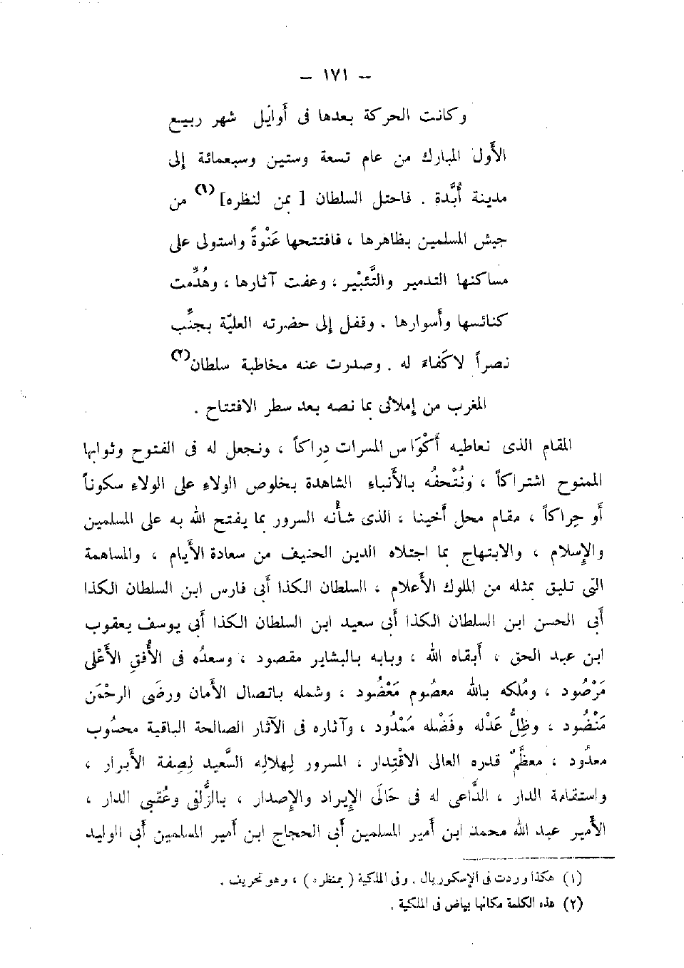 الْمقَام الَّذِي نعاطيه أكواس المسرات دراكا، ونجعل لَهُ فِي الْفتُوح وثوابها الممنوح اشتراكا، ونتحفه بالأنباء الشاهدة بخلوص الْوَلَاء على الْوَلَاء سكونا أَو حراكا، مقَام مَحل أخينا، الَّذِي شَأْنه السرُور بِمَا يفتح الله بِهِ على الْمُسلمين وَالْإِسْلَام، والابتهاج بِمَا اجتلاه الدّين الحنيف من سَعَادَة الْأَيَّام، والمساهمة الَّتِي تلِيق بِمثلِهِ من الْمُلُوك الْأَعْلَام، السُّلْطَان الكذا أبي فَارس ابْن السُّلْطَان الكذا أبي الْحسن ابْن السُّلْطَان الكذا أبي سعيد ابْن السُّلْطَان الكذا أبي يُوسُف يَعْقُوب ابْن عبد الْحق، أبقاه الله، وبابه بالبشاير مَقْصُود، وسعده فِي الْأُفق الْأَعْلَى مرصود، وَملكه بِاللَّه مَعْصُوم معضود، وشمله باتصال الْأمان وَرَضي الرَّحْمَن منضود، وظل عدله وفضله مَمْدُود، وآثاره فِي الْآثَار الصَّالِحَة الْبَاقِيَة مَحْسُوب مَعْدُود، مُعظم قدره العالي الاقتدار، المسرور لهلاله السعيد لصفة الْأَبْرَار، واستقامة الدَّار، الدَّاعِي لَهُ فِي حَالي الْإِيرَاد والإصدار، بالزلفى وعقبي الدَّار، الْأَمِير عبد الله مُحَمَّد ابْن أَمِير الْمُسلمين أبي الْحجَّاج ابْن أَمِير الْمُسلمين أبي الْوَلِيد