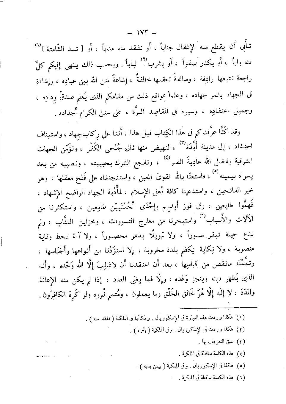 تأبى أَن يقطع مِنْهُ الإغفال جنابا، أَو تفقد مِنْهُ منابا، أَو [تسد الشامتة] مِنْهُ بَابا، أَو يكدر صفوا، أَو يشرب لبابا. وبحسب ذَلِك يُنْهِي إِلَيْكُم كل رَاجِعَة تتبعها رادفة، وسالفة تعقبها خالفة، إِشَاعَة لمنن الله بَين عباده، وإشادة فِي الْجِهَاد بثمر جهاده، وعلما بمواقع ذَلِك من مقامكم الَّذِي يعلم صدق وداده، وَجَمِيل اعْتِقَاده، وسيره فِي الْمَقَاصِد الْبرة، على سنَن الْكِرَام أجداده.
