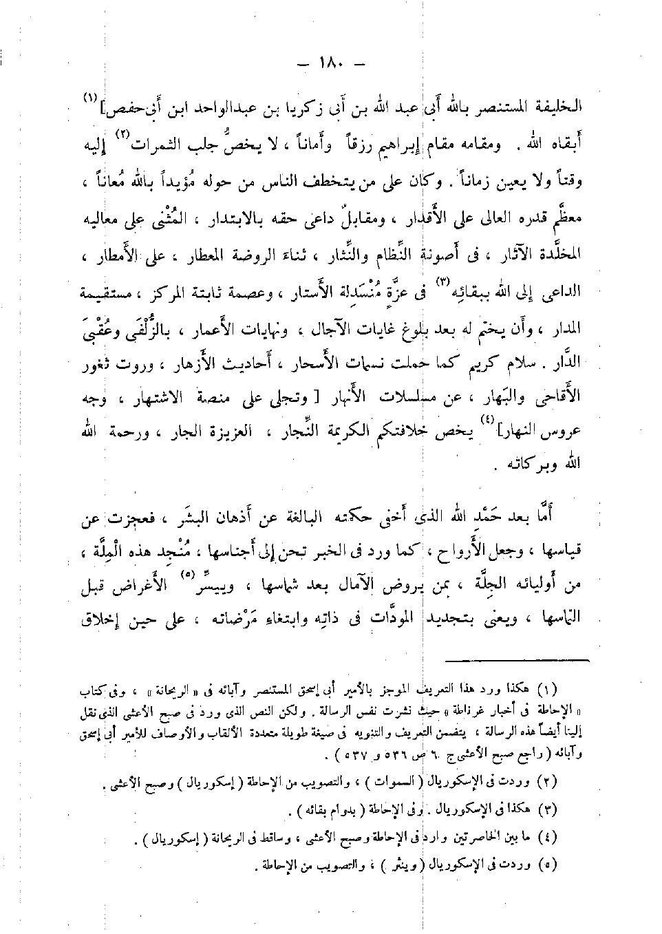 الْخَلِيفَة الْمُسْتَنْصر بِاللَّه أبي عبد الله بن أبي زَكَرِيَّا بن عبد الْوَاحِد ابْن أبي حَفْص] أبقاه الله. ومقامه مقَام إِبْرَاهِيم رزقا وأمانا، لَا يخص جلب الثمرات إِلَيْهِ وقتا وَلَا يعين زَمَانا. وَكَانَ على من يتخطف النَّاس من حوله مؤيدا بِاللَّه معانا، مُعظم قدره العالي على الأقدار، وَمُقَابل دَاعِي حَقه بالابتدار، الْمثنى على معاليه المخلدة الْآثَار، فِي أصونة النظام والنثار، ثَنَاء الرَّوْضَة المعطار، على الأمطار، الدَّاعِي إِلَى الله بِبَقَائِهِ فِي عزة منسدلة الأستار، وعصمة ثَابِتَة المركز مُسْتَقِيمَة الْمدَار، وَأَن يخْتم لَهُ بعد بُلُوغ غايات الْآجَال، ونهايات الْأَعْمَار، بالزلفى وعقبى الدَّار. سَلام كريم كَمَا حملت نسمات الأسحار، أَحَادِيث الأزهار، وروت ثغور الأقاحي والبهار، عَن مسلسلات الْأَنْهَار [وتجلي على منصة الاشتهار، وَجه عروس النَّهَار] يخص خلافتكم الْكَرِيمَة النجار، العزيزة الْجَار، وَرَحْمَة الله الله وَبَرَكَاته.