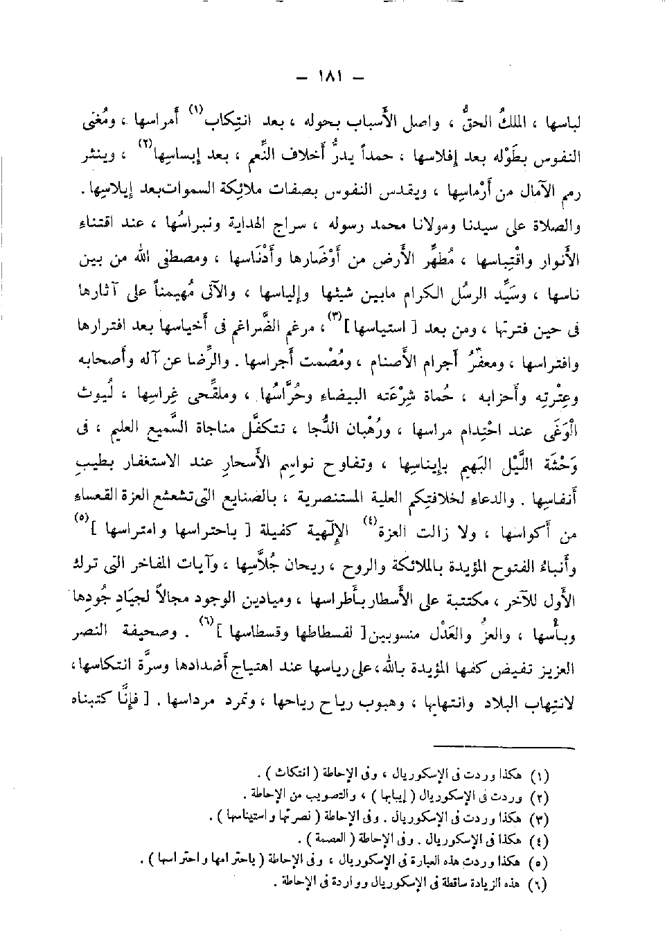 لباسها، الْملك الْحق، وَاصل الْأَسْبَاب بحوله، بعد انتكاب أمراسها، وَمُغْنِي النُّفُوس بِطُولِهِ بعد إفلاسها، حمدا يدر أخلاف النعم، بعد إبساسها، وينثر رمم الآمال من أرماسها، ويقدس النُّفُوس بِصِفَات مَلَائِكَة السَّمَوَات بعد إيلاسها. وَالصَّلَاة على سيدنَا ومولانا مُحَمَّد رَسُوله، سراج الْهِدَايَة ونبراسها، عِنْد اقتناء الْأَنْوَار واقتباسها، مطهر الأَرْض من أوضارها وأدناسها، ومصطفى الله من بَين ناسها، وَسيد الرُّسُل الْكِرَام مَا بَين شيثها وإلياسها، والآتي مهيمنا على آثارها فِي حِين فترتها، وَمن بعد [استياسها] ، مرغم الضراغم فِي أخياسها بعد افترارها وافتراسها، ومعفر أجرام الْأَصْنَام، ومصمت أجراسها. وَالرِّضَا عَن آله وَأَصْحَابه وعترته وأحزابه، حماة شرعته الْبَيْضَاء وحراسها، وملقحى غراسها، لُيُوث الوغى عِنْد احتدام مراسها، وَرُهْبَان الدجا، تتكفل مُنَاجَاة السَّمِيع الْعَلِيم، فِي وَحْشَة اللَّيْل البهيم بإيناسها، وتفاوح نواسم الأسحار عِنْد الاسْتِغْفَار بِطيب أنفاسها. وَالدُّعَاء لخلافتكم الْعلية المستنصرية، بالصنايع الَّتِي تشعشع الْعِزَّة القعساء من أكواسها، وَلَا زَالَت الْعِزَّة الإلهية كفيلة [باحتراسها وامتراسها] وأنباء الْفتُوح المؤيدة بِالْمَلَائِكَةِ وَالروح، ريحَان جلاسها، وآيات المفاخر الَّتِي ترك الأول للْآخر، مكتتبة على الأسطار بأطراسها. وميادين الْوُجُود مجالا لجياد جودها وبأسها. والعز وَالْعدْل منسوبين [لفسطاطها وقسطاسها] . وصحيفة النَّصْر الْعَزِيز تفيض كفها المؤيدة بِاللَّه، على رياسها عِنْد اهتياج أضدادها وسرة انتكاسها، لانتهاب الْبِلَاد وانتهابها، وهبوب ريَاح رياحها، وتمرد مرداسها. [فَإنَّا كتبناه