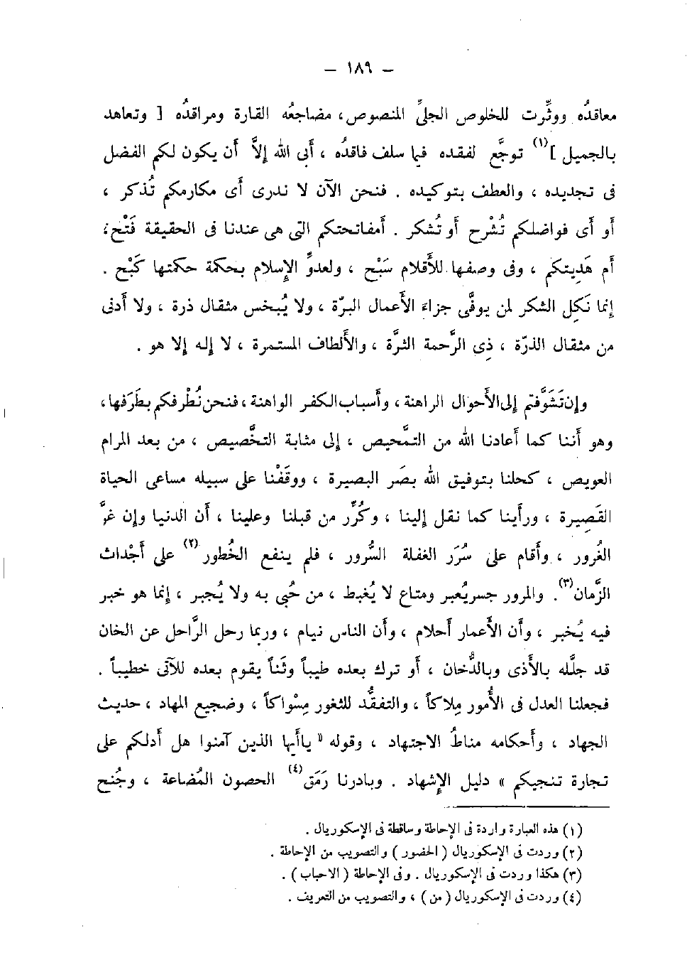 وَإِن تشوفتم إِلَى الْأَحْوَال الراهنة , وَأَسْبَاب الْكفْر الواهنة , فَنحْن نطرفكم بطرفها , وَهُوَ أننا كَمَا أعادنا الله من التمحيص , إِلَى مثابة التَّخْصِيص , من بعد المرام العويص , كحلنا بِتَوْفِيق الله بصر البصيرة , ووقفنا على سَبيله مساعي الْحَيَاة القصيرة , ورأينا كَمَا نقل إِلَيْنَا , وَكرر من قبلنَا وعلينا , أَن الدُّنْيَا وَإِن غر الْغرُور , وَأقَام على سرر الْغَفْلَة السرُور , فَلم ينفع الخطور على أجداث الزَّمَان. والمرور جسر يعبر ومتاع لَا يغبط , من حبى بِهِ وَلَا يجْبر , إِنَّمَا هُوَ خبر فِيهِ يخبر , وَأَن الْأَعْمَار أَحْلَام , وَأَن النَّاس نيام ووربما رَحل الراحل عَن الخان قد جلله بالأذى وبالدخان , أَو ترك بعده طيبا وثنا يقوم بعده للآتي خَطِيبًا. فَجعلنَا الْعدْل فِي الْأُمُور ملاكا , والتفقد للثغور مسواكا , وضجيع المهاد , حَدِيث الْجِهَاد , وَأَحْكَامه منَاط الِاجْتِهَاد , وَقَوله {يَا أَيهَا الَّذين آمنُوا هَل أدلكم على تِجَارَة تنجيكم} دَلِيل الْإِشْهَاد. وبادرنا رَمق الْحُصُون المضاعة , وجنح