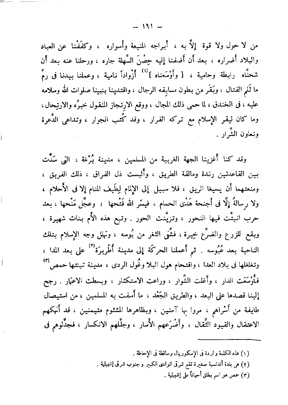 من لَا حول وَلَا قُوَّة إِلَّا بِهِ، أبراجه المنيعة وأسواره، وكففنا عَن الْعباد والبلاد أضراره، بعد أَن أضفنا إِلَيْهِ حصن السهلة جَاره، ورحلنا عَنهُ بعد أَن شحناه رابطة وحامية، [وأوسعناه] أزوادا نامية، وعملنا بيدنا فِي رم مَا ثلم الْقِتَال، وبقر من بطُون مسابقه الرِّجَال، واقتدينا بنبينا صلوَات الله وَسَلَامه عَلَيْهِ، فِي الخَنْدَق، لما حمى ذَلِك المجال، وَوَقع الارتجاز الْمَنْقُول خَبره والارتحال، وَمَا كَانَ لِيُقِر الْإِسْلَام مَعَ تَركه الْقَرار، وَقد كتب الْجوَار، وتداعي الدعْوَة وتعاون الشرار.