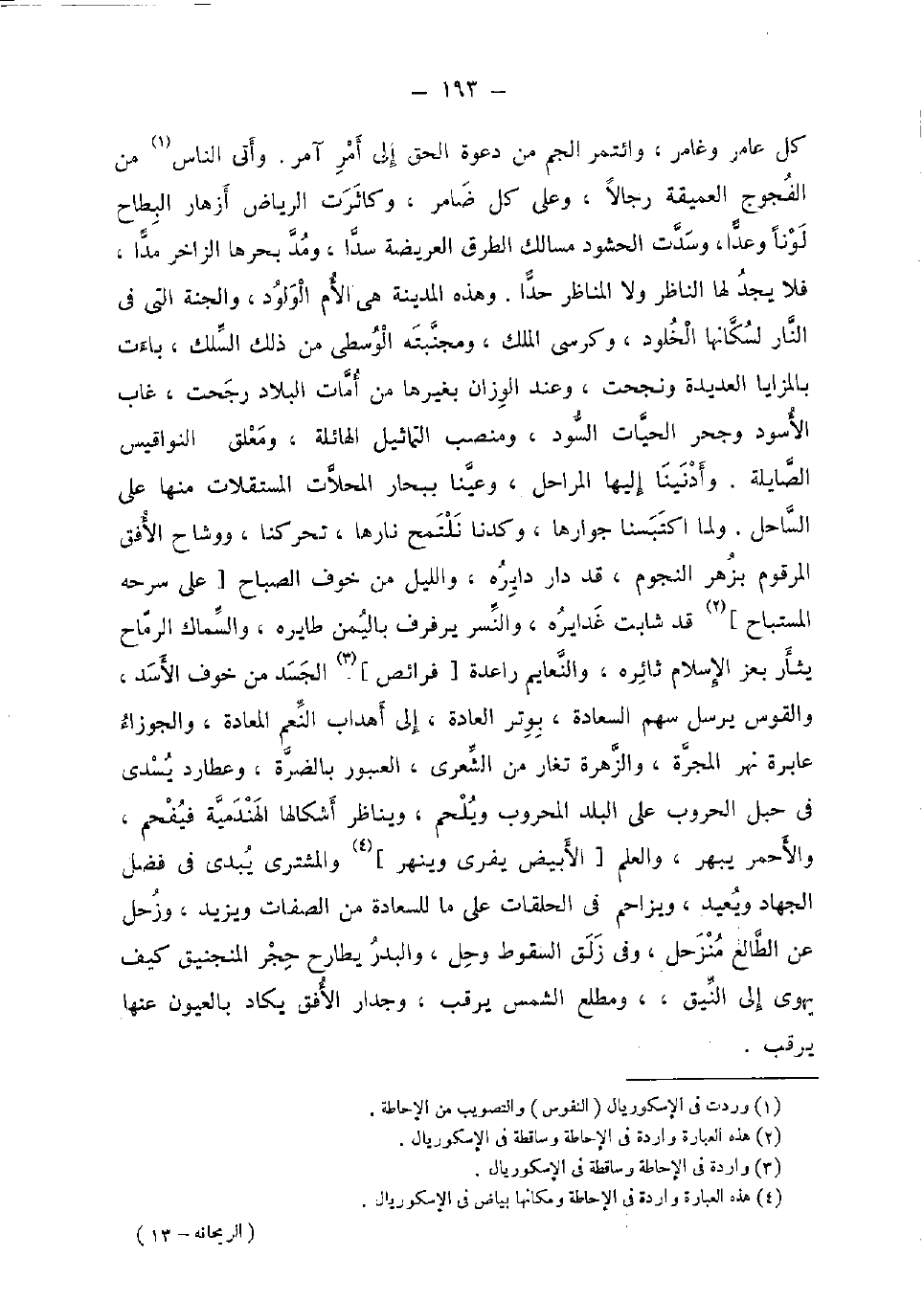 كل عَامر وغامر، وائتمر الجم من دَعْوَة الْحق إِلَى أَمر آمُر. وَآتى النَّاس من الفجوج العميقة رجَالًا، وعَلى كل ضامر، وكاثرت الرياض أزهار البطاح لونا وَعدا، وسدت الحشود مسالك الطّرق العريضة سدا وَمد بحرها الزاخر مدا، فَلَا يجد لَهَا النَّاظر وَلَا المناظر حدا. وَهَذِه الْمَدِينَة هِيَ الْأُم الْوَلُود، وَالْجنَّة الَّتِي فِي النَّار لسكانها الخلود، وكرسي الْملك، ومجنبته الْوُسْطَى من ذَلِك السلك، باءت باالمزايا العديدة ونجحت، وَعند الْوزان بغَيْرهَا من أمات الْبِلَاد رجحت، غَابَ الْأسود وجحر الْحَيَّات السود، ومنصب التماثيل الهائلة، ومعلق النواقيس الصايلة. وأدنينا إِلَيْهَا المراحل، وعينا ببحار المحلات المستقلات مِنْهَا على السَّاحِل. وَلما اكتسبنا جوارها، وكدنا نلتمح نارها، تحركنا، ووشاح الْأُفق المرقوم بزهر النُّجُوم، قد دَار دايره، وَاللَّيْل من خوف الصَّباح [على سرحه المستباح] قد شابت غدايره، والنسر يرفرف بِالْيمن طايره، والسماك والرماح يثأر بعز الْإِسْلَام ثائره، والنعايم راعدة [فرائص] الْجَسَد من خوف الْأسد، والقوس يُرْسل سهم السَّعَادَة، بِوتْر الْعَادة، إِلَى أهداب النعم الْمُعَادَة، والجوزاء عابرة نهر المجرة، والزهرة تغار من الشعرى، العبور بالضرة، وَعُطَارِد يسدي فِي حَبل الحروب على الْبَلَد المحروب ويلحم، ويناظر أشكالها الهندمية فيفحم، والأحمر يبهر، وَالْعلم [الْأَبْيَض يفري وينهر] وَالْمُشْتَرِي يُبْدِي فِي فضل الْجِهَاد وَيُعِيد، ويزاحم فِي الحلقات على مَا للسعادة من الصِّفَات وَيزِيد، وزحل عَن الطالع منزحل، وَفِي زلق السُّقُوط وَحل، والبدر يطارح حجر المنجنيق كَيفَ يهوى إِلَى النيق، ومطلع الشَّمْس يرقب، وجدار الْأُفق يكَاد بالعيون عَنْهَا يرقب