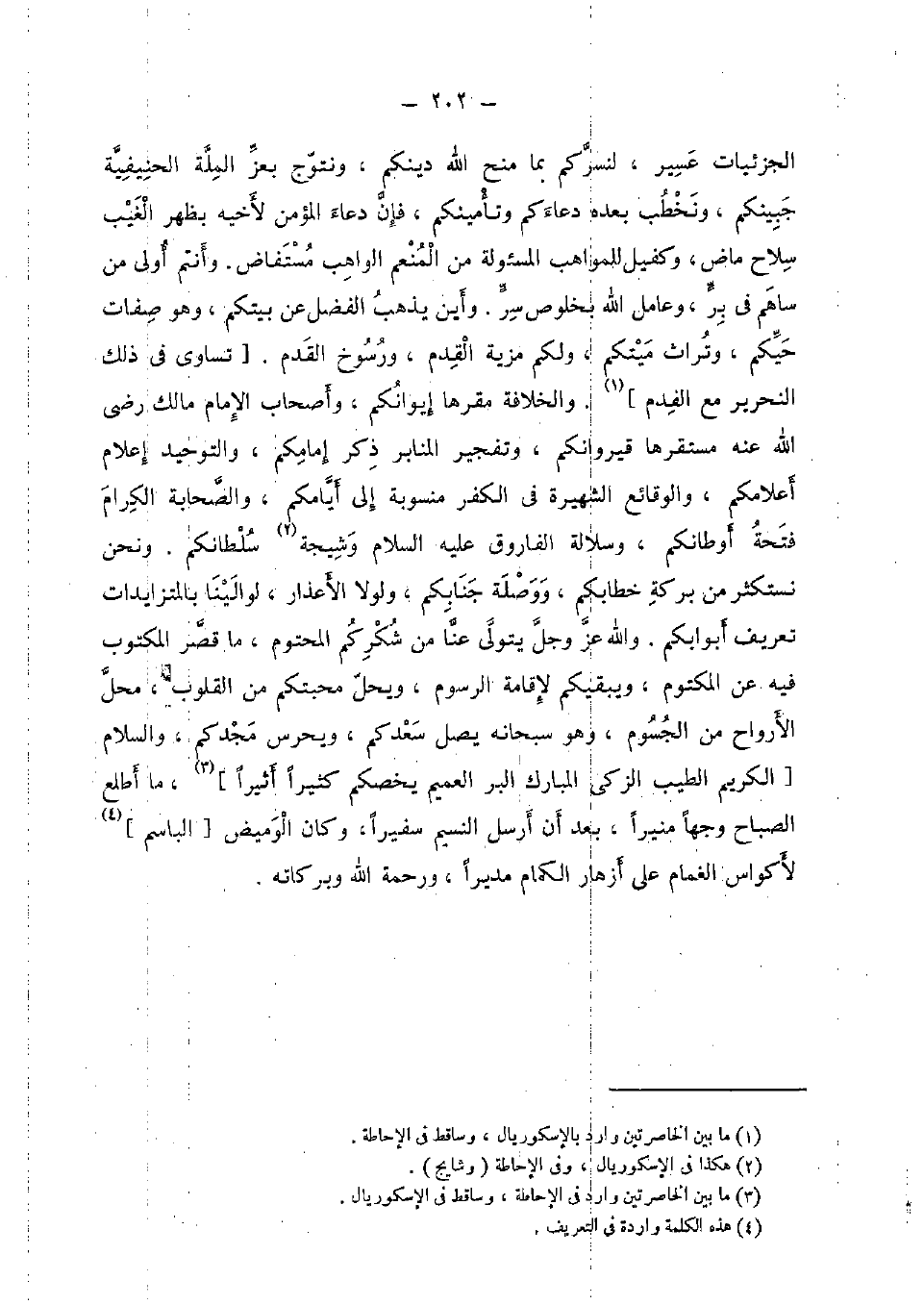 الجزئيات عسير، لنسركم بِمَا منح الله دينكُمْ، ونتوج بعز الْملَّة الحنيفية جبينكم، ونخطب بعده دعاءكم وتأمينكم، فَإِن دُعَاء الْمُؤمن لِأَخِيهِ بِظهْر الْغَيْب سلَاح مَاض، وكفيل للمواهب المسئولة من الْمُنعم الْوَاهِب مستفاض. وَأَنْتُم أولى من ساهم فِي بر، وعامل الله بخلوص سر، وَأَيْنَ يذهب الْفضل عَن بَيتكُمْ، وَهُوَ صِفَات حيكم، وتراث ميتكم، وَلكم مزية الْقدَم، ورسوخ الْقدَم. [تَسَاوِي فِي ذَلِك التَّحْرِيم مَعَ الفدم] . والخلافة مقرها إيوانكم، وَأَصْحَاب الإِمَام مَالك رَضِي الله عَنهُ مستقرها قيروانكم، وتفجير المنابر ذكر إمامكم، والتوحيد إِعْلَام أعلامكم، والوقائع الشهيرة فِي الْكفْر منسوبة إِلَى أيامكم، وَالصَّحَابَة الْكِرَام فَتْحة أوطانكم، وسلالة الْفَارُوق عَلَيْهِ السَّلَام وشيجة سلطانكم، وَنحن نَسْتَكْثِر من بركَة خطابكم، ووصلة جنابكم، وَلَوْلَا الْأَعْذَار، لوالينا بالمتزايدات تَعْرِيف أبوابكم. وَالله عز وَجل يتَوَلَّى عَنَّا من شكركم المحتوم، مَا قصر الْمَكْتُوب فِيهِ عَن المكتوم، ويبقيكم لإِقَامَة الرسوم، وَيحل محبتكم من الْقُلُوب، مَحل الْأَرْوَاح من الجسوم، وَهُوَ سُبْحَانَهُ يصل سعدكم، ويحرس مجدكم، وَالسَّلَام [الْكَرِيم الطّيب الزكي الْمُبَارك الْبر العميم يخصكم كثيرا أثيرا] ، مَا أطلع الصَّباح وَجها منيرا، بعد أَن أرسل النسيم سفيرا، وَكَانَ الوميض [الباسم] لأكواس الْغَمَام على أزهار الكمام مديرا، وَرَحْمَة الله وَبَرَكَاته.