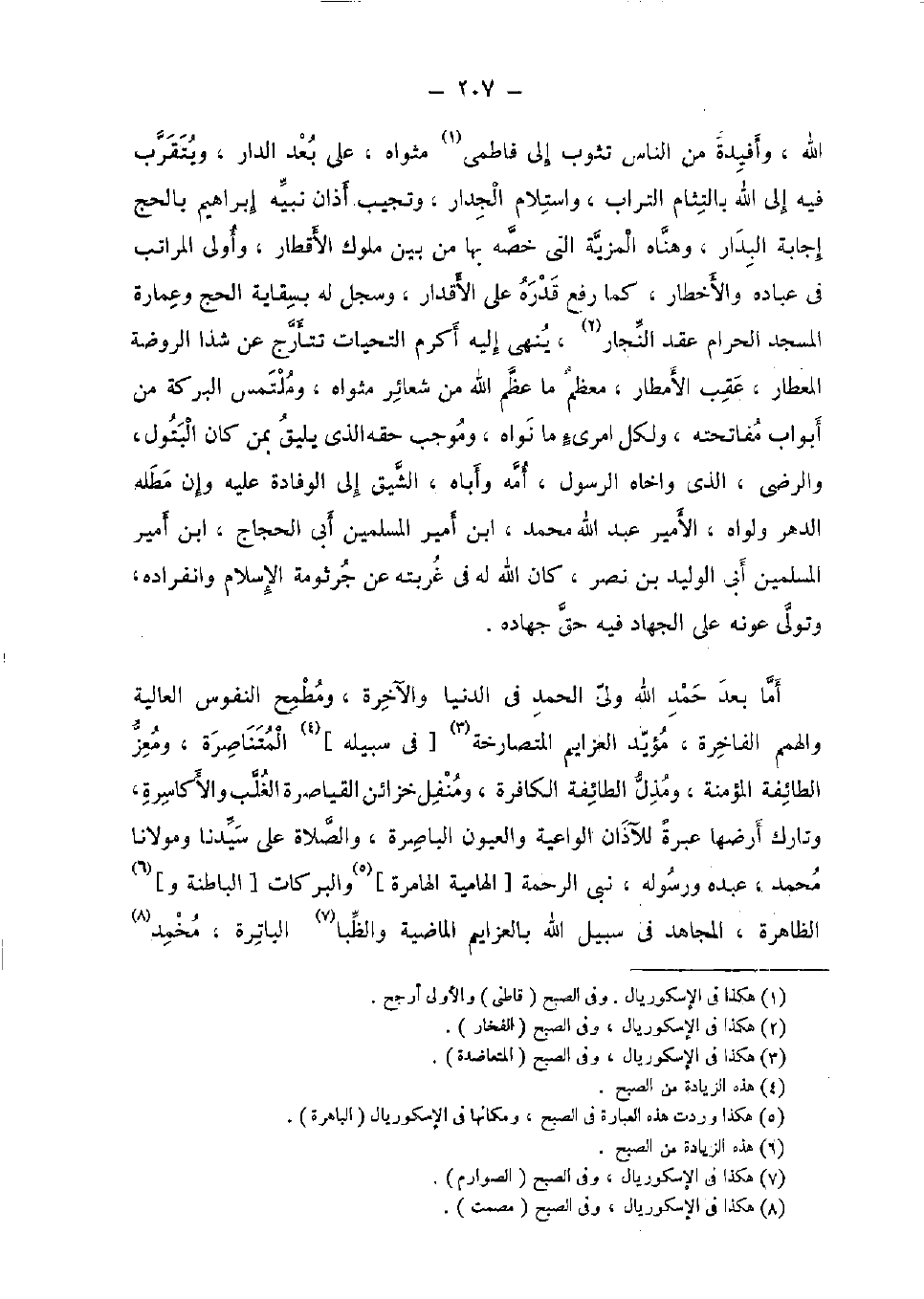 أما بعد حمد الله ولي الْحَمد فِي الدُّنْيَا وَالْآخِرَة، ومطمح النُّفُوس الْعَالِيَة والهمم الفاخرة، مؤيد العزايم المتصارخة [فِي سَبيله] المتناصرة، ومعز الطَّائِفَة المؤمنة، ومذل الطَّائِفَة الْكَافِرَة، ومنفل خَزَائِن القياصرة الغلب والأكاسرة، وتارك أرْضهَا عِبْرَة للآذان الواعية والعيون الباصرة، وَالصَّلَاة على سيدنَا ومولانا مُحَمَّد، عَبده وَرُسُله، نَبِي الرَّحْمَة [الهامية الهامرة] والبركات [الْبَاطِنَة و] الظَّاهِرَة، الْمُجَاهِد فِي سَبِيل الله بالعزايم الْمَاضِيَة والظبا الباترة، مخمد