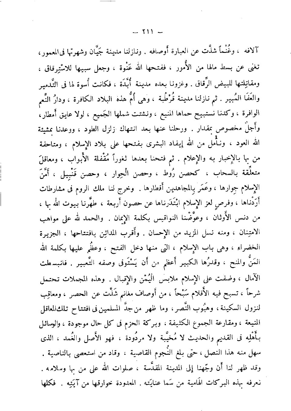 آلافه، وَغنما شذت عَن الْعبارَة أَوْصَافه. ونازلنا مَدِينَة جيان وشهرتها فِي الْمَعْمُور، تغنى عَن بسط مَالهَا من الْأُمُور، فَفَتحهَا الله عنْوَة، وَجعل سبيهَا للاسترقاق، ومقاتلتها للبيض الرقَاق. وغزونا بعده مَدِينَة أبدة، فَكَانَت أُسْوَة لَهَا فِي التدمير والعفا الميير. ثمَّ نازلنا مَدِينَة قرطبة، وَهِي أم هَذِه الْبِلَاد الْكَافِرَة، وَدَار النعم الوافرة، وكدنا نستبيح حماها المنيع، ونشتت شملها الْجَمِيع، لَوْلَا عايق أمطار، وَأجل مَخْصُوص بِمِقْدَار. ورحلنا عَنْهَا بعد انتهاك زلزل الطود، ووعدنا بِمَشِيئَة الله الْعود، ونأمل من الله إيفاد الْبُشْرَى بِفَتْحِهَا على بِلَاد الْإِسْلَام، ومتاحفة من بهَا بالإخبار بِهِ والإعلام. ثمَّ فتحنا بعْدهَا ثغورا مقفلة الْأَبْوَاب، ومعاقل مُتَعَلقَة بالسحاب، كحصن روط، وحصن الحوار، وحصن قنبيل، أَمن الْإِسْلَام جوارها، وَعمر بالمجاهدين أقطارها. وَخرج لنا ملك الرّوم فِي مشارطات أردناها، وفرص لعز الْإِسْلَام ابتدرناها عَن حصون أَرْبَعَة، طهرنا بيُوت الله بهَا، من دنس الْأَوْثَان، وعوضنا النواقيس بِكَلِمَة الْإِيمَان. وَالْحَمْد لله على الْمَوَاهِب الامتنان، وَمِنْه نسل الْمَزِيد من الْإِحْسَان. وَأقرب الْمَدَائِن بافتتاحها، الجزيرة الخضراء، وَهِي بَاب الْإِسْلَام، الَّتِي مِنْهَا دخل الْفَتْح، وَعظم عَلَيْهَا بِكَلِمَة الله الْمَنّ والمنح، وقدرها الْكَبِير أعظم من أَن يَسْتَوْفِي وَصفه التَّعْبِير. فانبسطت الآمال، وضفت على الْإِسْلَام ملابس الْيمن والإقبال. وَهَذِه المجملات تحْتَمل شرحا، تسبح فِيهِ الأقلام سبحا، من أَوْصَاف مَغَانِم شذت عَن الْحصْر، ومعاقب لنزول السكينَة، وهبوب النَّصْر، وَمَا ظهر من جد الْمُسلمين فِي افْتِتَاح تِلْكَ المعاقل المنيعة، ومقارعة الجموع الكثيفة، وبركة الحزم فِي كل حَال مَوْجُودَة، والوسائل بأَهْله فِي الْقَدِيم والْحَدِيث لَا مخيبة وَلَا مَرْدُودَة، فَهُوَ الأَصْل والغمد، الَّذِي سهل مِنْهُ هَذَا النصل، حَتَّى بلغ النُّجُوم القاصية، وقاد من استعصى بالناصية. وَقد ظهر لنا أَن وجهنا إِلَى الْمَدِينَة المقدسة، صلوَات الله على من بهَا وَسَلَامه. نعرفه بِهَذِهِ البركات الهامية من سما عنايته. المعدودة خوارقها من آيَته. فَكلهَا