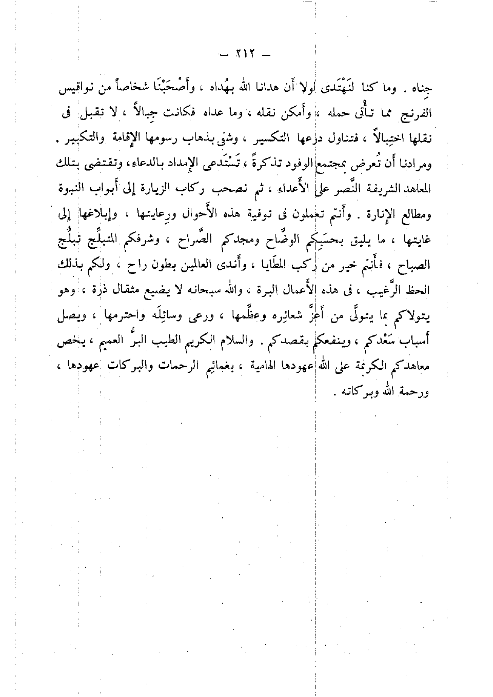 جناه. وَمَا كُنَّا لنهتدي لَوْلَا أَن هدَانَا الله بهداه، وأصحبنا شخاصا من نواقيس الفرنج مِمَّا تَأتي حمله، وَأمكن نَقله، وَمَا عداهُ فَكَانَت جبالا، لَا تقبل فِي نقلهَا اختبالا، فَتَنَاول درعها التكسير، وشفي بذهاب رسومها الْإِقَامَة وَالتَّكْبِير. ومرادنا أَن تعرض بمجتمع الْوُفُود تذكرة، تستدعي الْإِمْدَاد بِالدُّعَاءِ، وتقتضى بِتِلْكَ الْمعَاهد الشَّرِيفَة النَّصْر على الْأَعْدَاء، ثمَّ نصحب ركاب الزِّيَارَة إِلَى أَبْوَاب النُّبُوَّة ومطالع الإنارة. وَأَنْتُم تَعْمَلُونَ فِي تَوْفِيَة هَذِه الْأَحْوَال ورعايتها، وإبلاغها إِلَى غايتها، مَا يَلِيق بحسبكم الوضاح ومجدكم الصراح، وشرفكم المتبلج تبلج الصَّباح، فَأنْتم خير من ركب المطايا، وأندى الْعَالمين بطُون رَاح، وَلكم بذلك الْحَظ الرغيب، فِي هَذِه الْأَعْمَال الْبرة، وَالله سُبْحَانَهُ لَا يضيع مِثْقَال ذرة، وَهُوَ يتولاكم بِمَا يتَوَلَّى من أعز شعائره وعظمها، ورعى وسائله واحترمها، ويصل أَسبَاب سعدكم، وينفعكم بقصدكم. وَالسَّلَام الْكَرِيم الطّيب الْبر العميم، يخص معاهدكم الْكَرِيمَة على الله عهودها الهامية، بغمائم الرحمات والبركات عهودها، وَرَحْمَة الله وَبَرَكَاته.