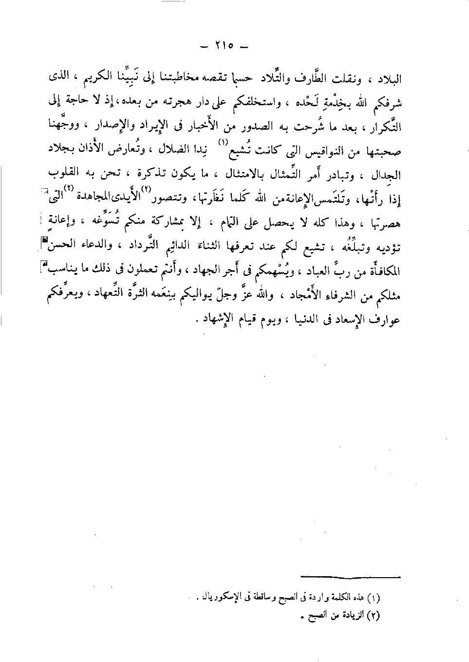 الْبِلَاد، ونقلت الطارف والتلاد حَسْبَمَا تقصه مخاطبتنا إِلَى نَبينَا الْكَرِيم، الَّذِي شرفكم لله بِخِدْمَة لحده، واستخلفكم على دَار هجرته من بعده، إِذْ لَا حَاجَة إِلَى التّكْرَار، بعد مَا شرحت بِهِ الصُّدُور من الْأَخْبَار فِي الْإِيرَاد والإصدار، ووجهنا صحبتهَا من النواقيس الَّتِي كَانَت تشيع ندا الضلال، وتعارض الْأَذَان بجلاد الْجِدَال، وتبادر أَمر التمثال بالامتثال، مَا يكون تذكرة، تحن بِهِ الْقُلُوب إِذا رأتها، وتلتمس الْإِعَانَة من الله كلما نظرتها، وتتصور الْأَيْدِي المجاهدة الَّتِي هصرتها، وَهَذَا كُله لَا يحصل على التَّمام، إِلَّا بمشاركة مِنْكُم تسوغه، وإعانة تُؤَدِّيه وتبلغه، تشيع لكم عِنْد تعرفها الثَّنَاء الدَّائِم الترداد، وَالدُّعَاء الْحسن الْمُكَافَأَة من رب الْعباد، ويسهمكم فِي أجر الْجِهَاد، وَأَنْتُم تَعْمَلُونَ فِي ذَلِك مَا يُنَاسب مثلكُمْ من الشرفاء الأمجاد، وَالله عز وَجل يواليكم بنعمه الثرة التعهاد، ويعرفكم عوارف الإسعاد فِي الدُّنْيَا، وَيَوْم قيام الْإِشْهَاد.