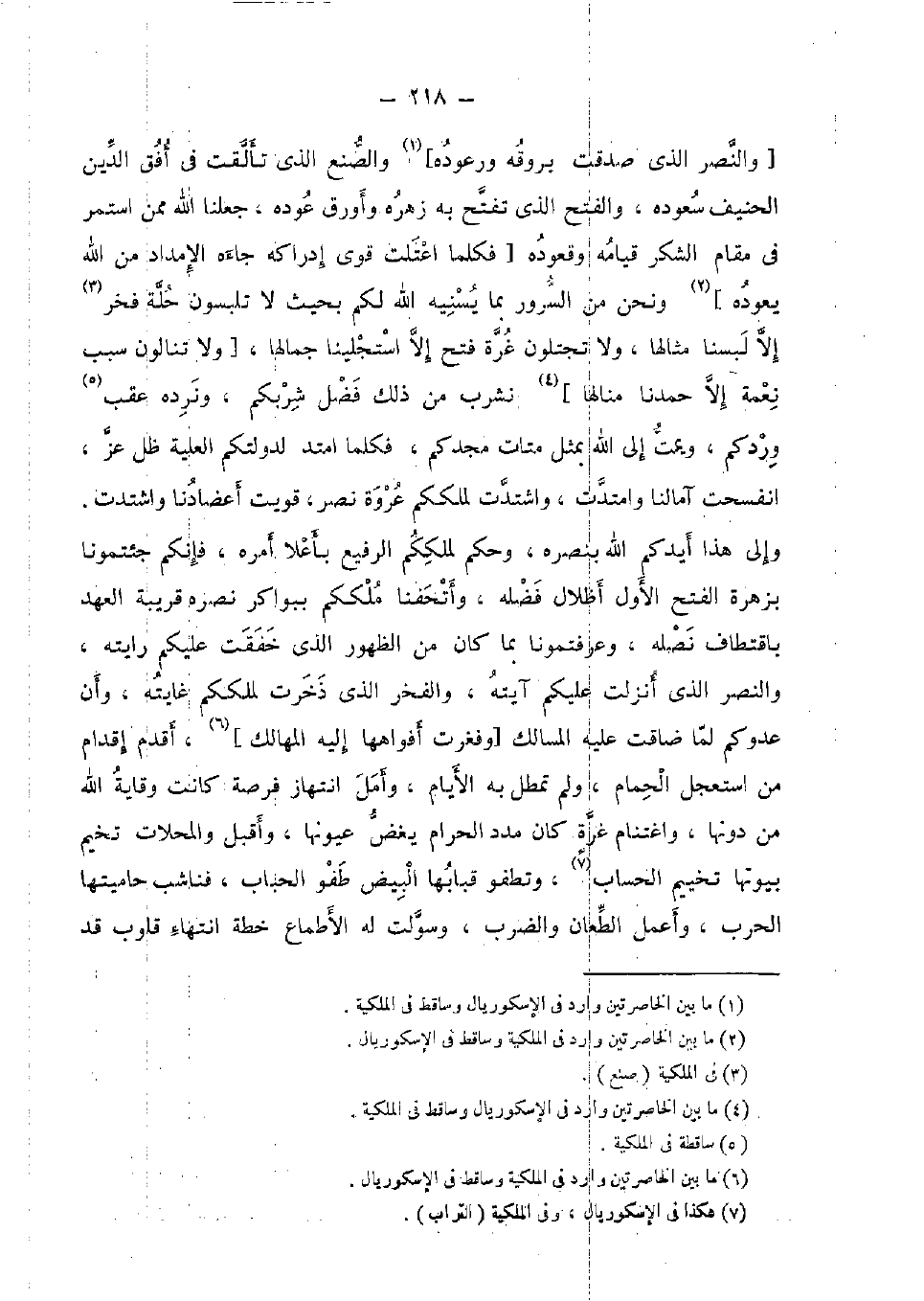 [000 والنصر الَّذِي صدقت بروقه ورعوده] والصنع الَّذِي تألقت فِي أفق الدّين الحنيف سعوده، وَالْفَتْح الَّذِي تفتح بِهِ زهره وأورق عوده، جعلنَا الله مِمَّن اسْتمرّ فِي مقَام الشُّكْر قِيَامه وقعوده [فَكلما اعتلت قوى إِدْرَاكه جَاءَهُ الْإِمْدَاد من الله يعودهُ] وَنحن من السرُور بِمَا يسنيه الله لكم بِحَيْثُ لَا تلبسُونَ حلَّة فَخر إِلَّا لبسنا مثالها، وَلَا تجتلون غرَّة فتح إِلَّا استجلينا جمَالهَا، [وَلَا تنالون سَبَب نعْمَة إِلَّا حمدنا منالها] نشرب من ذَلِك فضل شربكم، ونرده عقب وردكم، ويمت إِلَى الله بِمثل متات مجدكم، فَكلما امْتَدَّ لدولتكم الْعلية ظلّ عز، انفسحت آمالنا وامتدت، واشتدت لملككم عُرْوَة نصر، قويت أعضادنا واشتدت. وَإِلَى هَذَا أيدكم الله بنصره، وَحكم لملككم الرفيع بأعلا أمره، فَإِنَّكُم جئتمونا بزهرة الْفَتْح الأول أظلال فَضله، وأتحفنا ملككم ببواكر نَصره قريبَة الْعَهْد باقتطاف نصله، وعرفتمونا بِمَا كَانَ من الظُّهُور الَّذِي خَفَقت عَلَيْكُم رايته، والنصر الَّذِي أنزلت عَلَيْكُم آيَته، وَالْفَخْر الَّذِي ذخرت لملككم غَايَته، وَأَن عَدوكُمْ لما ضَاقَتْ عَلَيْهِ المسالك [وفغرت أفواهها إِلَيْهِ المهالك] ، أقدم إقدام من استعجل الْحمام، وَلم تمطل بِهِ الْأَيَّام، وأمل انتهاز فرْصَة كَانَت وقاية الله من دونهَا، واغتنام غرَّة كَانَ مدد الْحَرَام يغض عيونها، وَأَقْبل والمحلات تخيم بيوتها تخييم الْحساب، وتطفو قبابها الْبيض طفو الْحباب، فناشب حاميتها الْحَرْب، وأعمل الطعان وَالضَّرْب، وسولت لَهُ الأطماع خطة انْتِهَاء قُلُوب قد