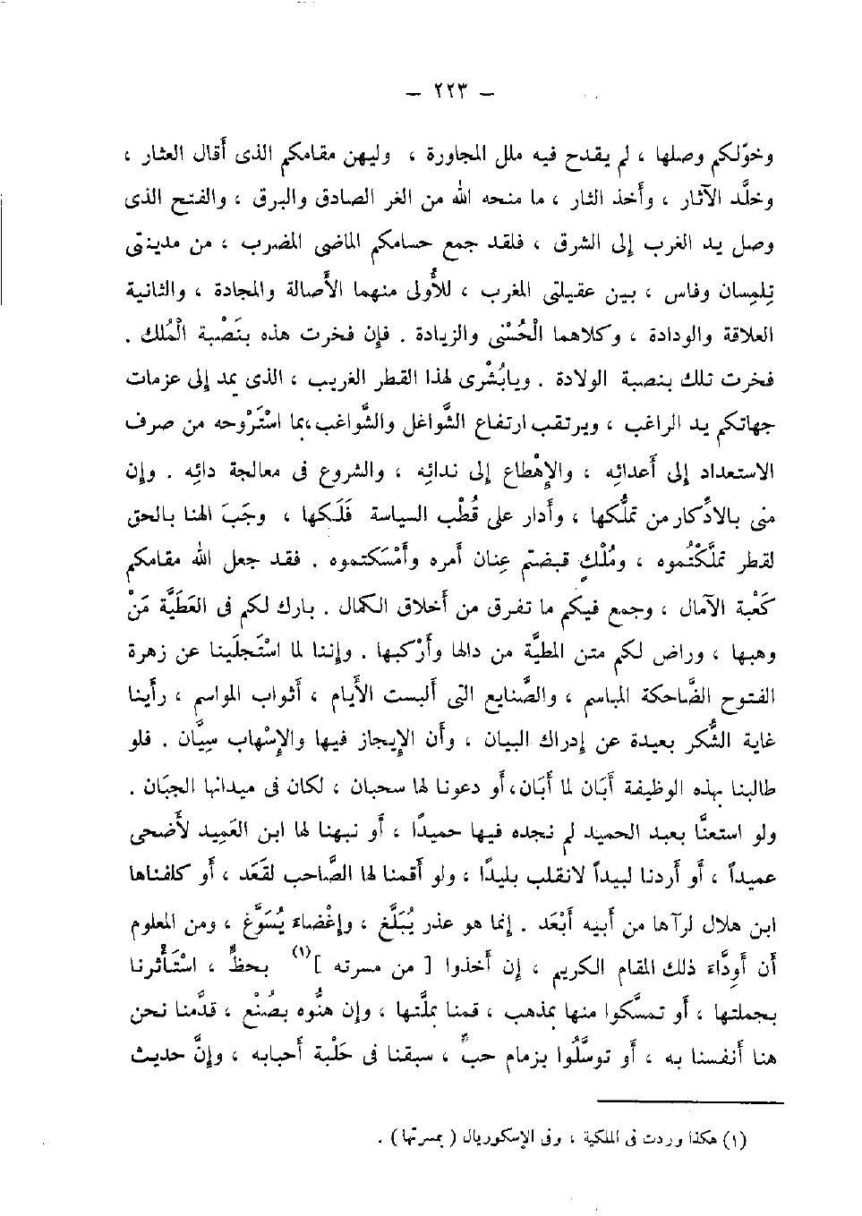 وخولكم وَصلهَا، لم يقْدَح فِيهِ ملل الْمُجَاورَة، وليهن مقامكم الَّذِي أقَال العثار، وخلد الْآثَار، وَأخذ الثار، مَا منحه الله من الغر الصَّادِق والبرق، وَالْفَتْح الَّذِي وصل يَد الغرب إِلَى الشرق، فَلَقَد جمع حسامكم الْمَاضِي المضرب، من مدينتي تلمسان وفاس، بَين عقيلتي الْمغرب، للأولى مِنْهُمَا الْأَصَالَة والمجادة، وَالثَّانيَِة العلاقة والودادة، وَكِلَاهُمَا الْحسنى وَالزِّيَادَة. فَإِن فخرت هَذِه بنصبة الْملك. فخرت تِلْكَ بنصبة الْولادَة. وَيَا بشرى لهَذَا الْقطر الْغَرِيب، الَّذِي يمد إِلَى عَزمَات جهاتكم يَد الرَّاغِب، ويرتقب ارْتِفَاع الشواغل والشواغب، بِمَا استروحه من صرف الاستعداد إِلَى أعدائه، والإهطاع إِلَى ندائه، والشروع فِي معالجة دائه. وَإِن منى بالادكار من تَملكهَا، وأدار على قطب السياسة فلكها، وَجب الهنا بِالْحَقِّ لقطر تملكتموه، وَملك قبضتم عنان أمره وأمسكتموه. فقد جعل الله مقامكم كعبة الآمال، وَجمع فِيكُم مَا تفرق من أَخْلَاق الْكَمَال. بَارك لكم فِي الْعَطِيَّة من وَهبهَا، وراض لكم متن المطية من دالها وأركبها. وإننا لما استجلينا عَن زهرَة الْفتُوح الضاحكة المباسم، والصنايع الَّتِي ألبست الْأَيَّام، أَثوَاب المواسم، رَأينَا غَايَة الشُّكْر بعيدَة عَن إِدْرَاك الْبَيَان، وَأَن الإيجاز فِيهَا والإسهاب سيان. فَلَو طالبنا بِهَذِهِ الْوَظِيفَة أبان لما أبان، أَو دَعونَا لَهَا سحبان، لَكَانَ فِي ميدانها الجبان. وَلَو استعنا بِعَبْد الحميد لم نجده فِيهَا حميدا، أَو نبهنا لَهَا ابْن العميد لأضحى عميدا، أَو أردنَا لبيدا لانقلب بليدا، وَلَو أَقَمْنَا لَهَا الصاحب لقعد، أَو كلفناها ابْن هِلَال لرآها من أَبِيه أبعد. إِنَّمَا هُوَ عذر يبلغ، وإغضاء يسوغ، وَمن الْمَعْلُوم أَن أوداء ذَلِك الْمقَام الْكَرِيم، إِن أخذُوا [من مسرته] بحظ، استأثرنا بجملتها، أَو تمسكوا مِنْهَا بِمذهب، قمنا بملتها، وَإِن هنوه بصنع، قدمنَا نَحن هُنَا أَنْفُسنَا بِهِ، أَو توسلوا بزمام حب، سبقنَا فِي حلبة أحبابه، وَإِن حَدِيث
