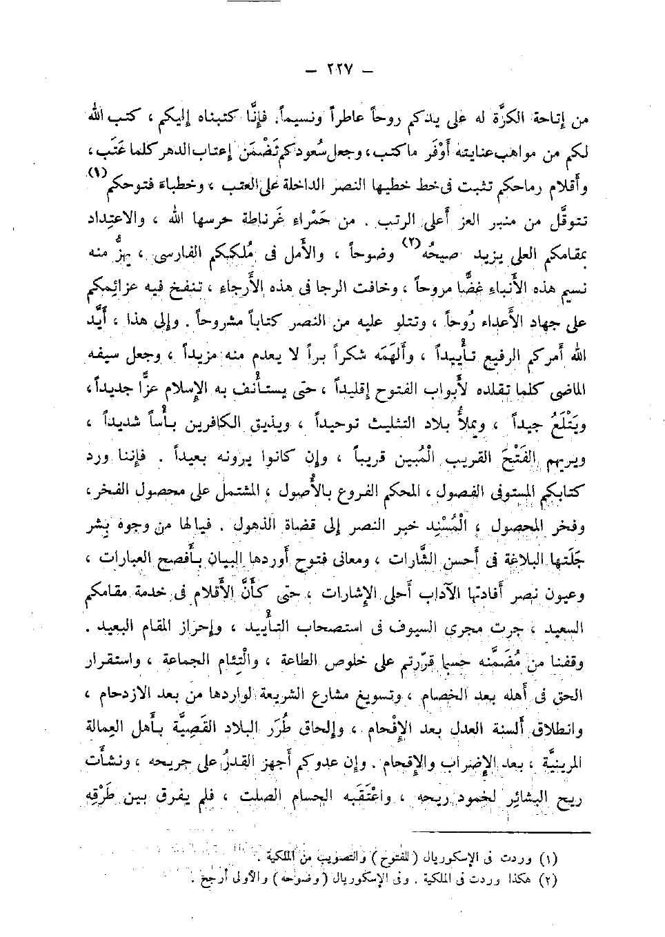 من إتاحة الكرة لَهُ على يدكم روحا عاطرا ونسيما. فَإنَّا كتبناه إِلَيْكُم، كتب الله لكم من مواهب عنايته أوفر مَا كتب، وَجعل سعودكم تضمن إعتاب الدَّهْر كلما عتب، وَأَقْلَام رماحكم تثبت فِي خطّ خطيها النَّصْر الدَّاخِلَة على العتب، وخطباء فتوحكم تتوقل من مِنْبَر الْعِزّ أَعلَى الرتب. من حَمْرَاء غرناطة حرسها الله، والاعتداد بمقامكم العلى يزِيد صبحه وضوحا، والأمل فِي ملككم الْفَارِسِي، يهز مِنْهُ نسيم هَذِه الأنباء غضا مروحا، وخافت الرجا فِي هَذِه الأرجاء تنفخ فِيهِ عزائمكم على جِهَاد الْأَعْدَاء روحا، وتتلو عَلَيْهِ من النَّصْر كتابا مشروحا. وَإِلَى هَذَا، أيد الله أَمركُم الرفيع تأييدا، وألهمه شكرا برا لَا يعْدم مِنْهُ مزيدا، وَجعل سَيْفه الْمَاضِي كلما تقلده لأبواب الْفتُوح إقليدا، حَتَّى يسْتَأْنف بِهِ الْإِسْلَام عزا جَدِيدا، ويتلع جيدا، ويملأ بِلَاد التَّثْلِيث توحيدا، وَيُذِيق الْكَافرين بَأْسا شَدِيدا، وَيُرِيهمْ الْفَتْح الْقَرِيب الْمُبين قَرِيبا، وَإِن كَانُوا يرونه بَعيدا. فإننا ورد كتابكُمْ الْمُسْتَوْفى الْفُصُول، الْمُحكم الْفُرُوع بالأصول، الْمُشْتَمل على محصول الْفَخر، وفخر الْمَحْصُول، الْمسند خبر النَّصْر إِلَى قُضَاة الذهول. فيالها من وُجُوه بشر جلتها البلاغة فِي أحسن الشارات، ومعاني فتوح أوردهَا الْبَيَان بأفصح الْعبارَات، وعيون نصر أفادتها الْآدَاب أحلى الإشارات، حَتَّى كَأَن الأقلام فِي خدمَة مقامكم السعيد، جرت مجْرى السيوف فِي اسْتِصْحَاب التأييد، وإحراز الْمقَام الْبعيد. وقفنا من مضمنه حَسْبَمَا قررتم على خلوص الطَّاعَة، والتئام الْجَمَاعَة، واستقرار الْحق فِي أَهله بعد الْخِصَام، وتسويغ مشارع الشَّرِيعَة لواردها من بعد الازدحام، وانطلاق أَلْسِنَة الْعدْل بعد الإفحام، وإلحاق طرر الْبِلَاد القصية بِأَهْل العمالة المرينية، بعد الإضراب والإقحام. وَإِن عَدوكُمْ أجهز الْقدر على جريحه، ونشأت ريح البشائر لخمود رِيحه، واعتقبه الحسام الصَّلْت، فَلم يفرق بَين طرفه