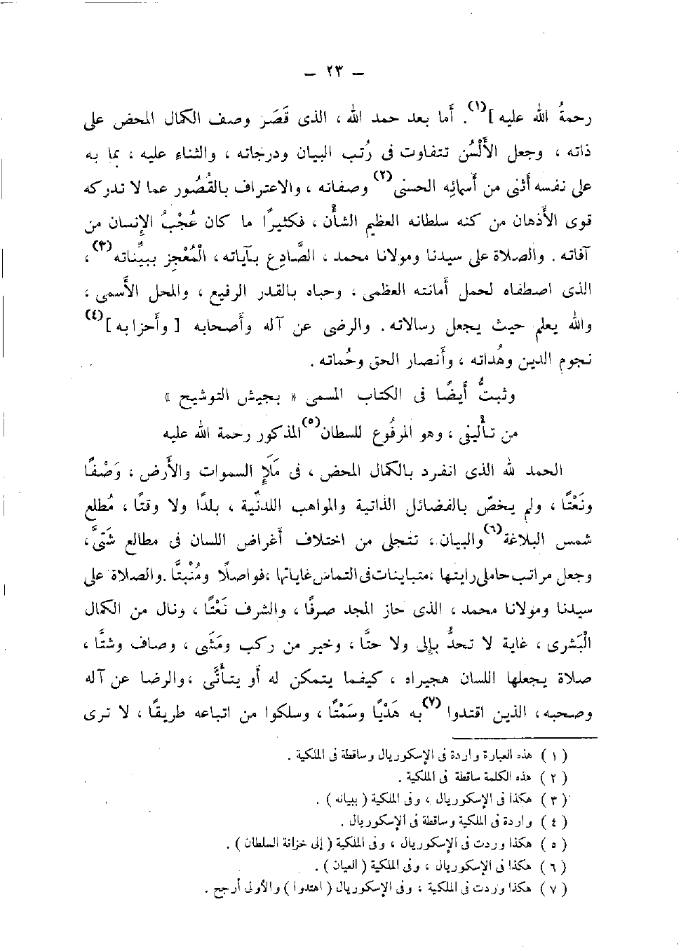 رَحْمَة الله عَلَيْهِ] . أما بعد حمد الله، الَّذِي قصر وصف الْكَمَال الْمَحْض على ذَاته، وَجعل الألسن تَتَفَاوَت فِي رتب الْبَيَان ودرجاته، وَالثنَاء عَلَيْهِ، بِمَا بِهِ على نَفسه أثنى من أَسْمَائِهِ الْحسنى وَصِفَاته، وَالِاعْتِرَاف بالقصور عَمَّا لَا تُدْرِكهُ قوى الأذهان من كنه سُلْطَانه الْعَظِيم الشَّأْن، فكثيرا مَا كَانَ عجب الْإِنْسَان من آفاته. وَالصَّلَاة على سيدنَا ومولانا مُحَمَّد، الصادع بآياته، المعجز ببيناته، الَّذِي اصطفاه لحمل أَمَانَته الْعُظْمَى، وحباه بِالْقدرِ الرفيع، وَالْمحل الأسمى، وَالله يعلم حَيْثُ يَجْعَل رسالاته. والرضى عَن آله وَأَصْحَابه [وأحزابه] نُجُوم الدّين وهداته، وأنصار الْحق وحماته.