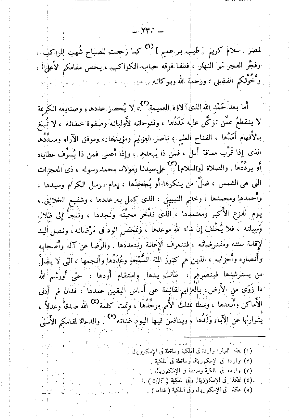 أما بعد حمد الله الَّذِي آلاؤه العميمة، لَا يحصر عَددهَا، وصنايعه الْكَرِيمَة لَا يَنْقَطِع عَمَّن توكل عَلَيْهِ مددها، وفتوحاته لأوليائه وصفوة خلفائه، لَا تبلغ بالأفهام أمدها، الفتاح الْعَلِيم، نَاصِر العزايم ومؤيدها، وموفق الآراء ومسددها الَّذِي إِذا قرب مَسَافَة أمل، فَمن ذَا يبعدها، وَإِذا أعْطى فَمن ذَا يسوف عطاياه أَو يُرَدِّدهَا. وَالصَّلَاة [وَالسَّلَام] على سيدنَا ومولانا مُحَمَّد رَسُوله، ذِي المعجزات الَّتِي هِيَ الشَّمْس، ضل من ينكرها أَو يجحدها، إِمَام الرُّسُل الْكِرَام وسيدها، وأحمدها ومحمدها، وَخَاتم النَّبِيين، الَّذِي كمل بِهِ عَددهَا، وشفيع الْخَلَائق، يَوْم الْفَزع الْأَكْبَر ومعتمدها، الَّذِي ندخر محبته ونجدها، ونلجأ إِلَى ظلال وسيلته، فَلَا يخلف إِن شَاءَ الله موعدها، ونمحص الود فِي مرضاته، ونصل الْيَد لإِقَامَة سنته ومفترضاته، فنتعرف الْإِعَانَة ونتعددها. وَالرِّضَا عَن آله وَأَصْحَابه وأنصاره وأحزابه، الَّذين هم كنوز الْملَّة السمحة وعددها وأنجمها، الَّتِي لَا يضل من يسترشدها فينصرهم، طَالَتْ يَدهَا واستقام أودها، حَتَّى أورثهم الله مَا زوى من الأَرْض، بالعزايم الْقَائِمَة على أساس الْيَقِين عمدها، فدان لَهُم أدنى الْأَمَاكِن وأبعدها، وسطا بمثلث الْأُمَم موحدها، وتمت كلمة الله صدقا وعدلاً، يتوارثها عَن الْآبَاء وَلَدهَا، وينافس فِيهَا الْيَوْم غداته. وَالدُّعَاء لمقامكم الْأَسْنَى