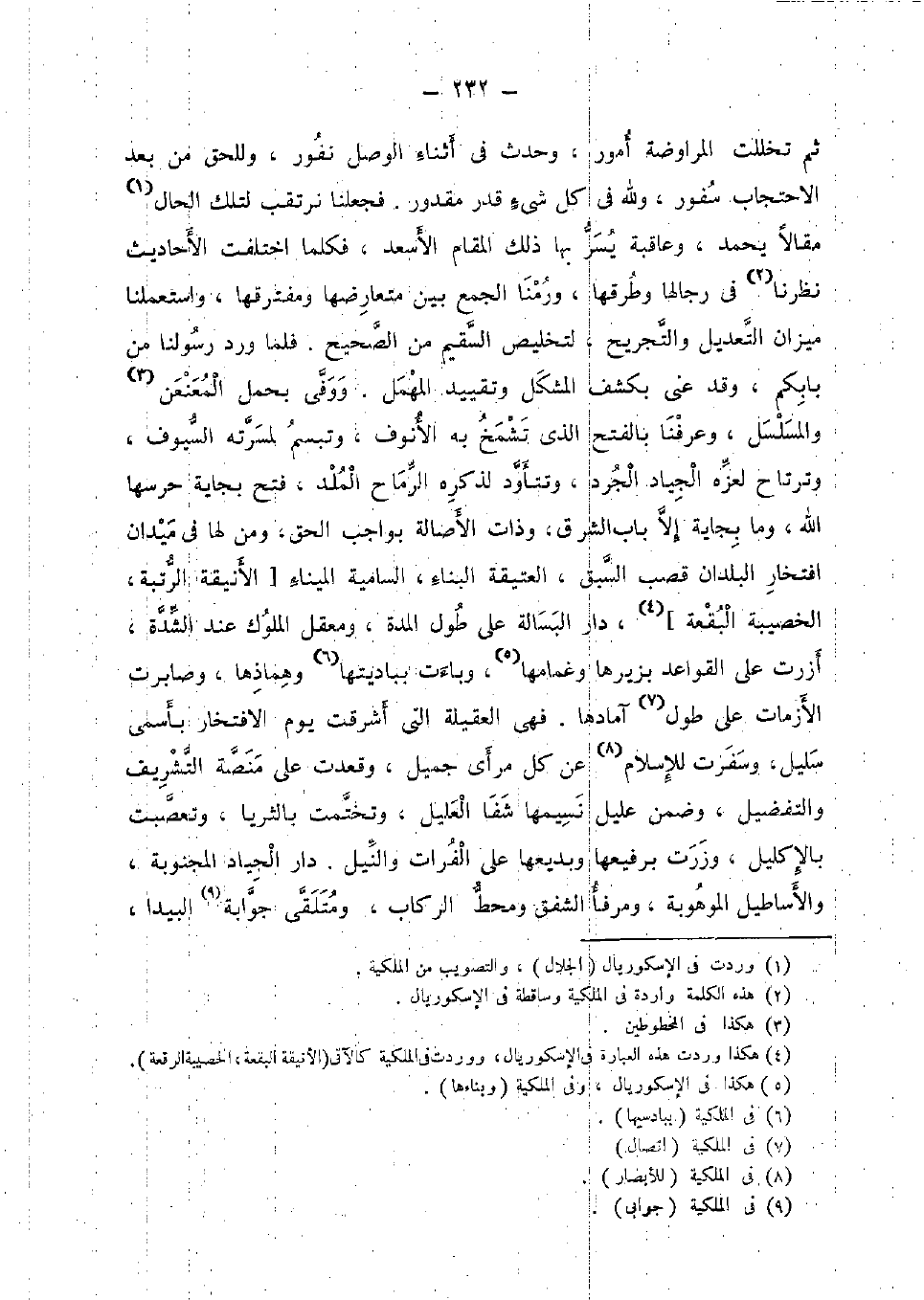 ثمَّ تخللت المراوضة أُمُور، وَحدث فِي أثْنَاء الْوَصْل نفور، وللحق من بعد الاحتجاب سفور، وَللَّه فِي كل شَيْء قدر مَقْدُور. فَجعلنَا نرتقب لتِلْك الْحَال مقَالا يحمد، وعاقبة يسر بهَا ذَلِك الْمقَام الأسعد، فَكلما اخْتلفت الْأَحَادِيث نَظرنَا فِي رجالها وطرقها، ورمنا الْجمع بَين متعارضها ومفترقها، واستعملنا ميزَان التَّعْدِيل وَالتَّجْرِيح، لتخليص السقيم من الصَّحِيح. فَلَمَّا ورد رَسُولنَا من بَابَكُمْ، وَقد عَنى بكشف الْمُشكل وَتَقْيِيد المهمل. ووفى بِحمْل المعنعن والمسلسل، وعرفنا بِالْفَتْح الَّذِي تشمخ بِهِ الأنوف، وَتَبَسم لمسرته السيوف، وترتاح لعزه الْجِيَاد الجرد، وتتأود لذكره الرماح الملد، فتح بجاية حرسها الله، وَمَا بجاية إِلَّا بَاب الشرق، وَذَات الْأَصَالَة بِوَاجِب الْحق، وَمن لَهَا فِي ميدان افتخار الْبلدَانِ قصب السَّبق، العتيقة الْبناء، السامية الميناء [الأنيقة الرُّتْبَة، الخصيبة الْبقْعَة] ، دَار البسالة على طول الْمدَّة، وَمَعْقِل الْمُلُوك عِنْد الشدَّة، أزرت على الْقَوَاعِد بزيرها وغمامها، وباءت بباديتها وهماذها، وصابرت الأزمات على طول آمادها. فَهِيَ العقيلة الَّتِي أشرقت يَوْم الافتخار بأسمى سليل، وسفرت لِلْإِسْلَامِ عَن كل مرأى جميل، وَقَعَدت على منصة التشريف والتفضيل، وَضمن عليل نسيمها شفا العليل، وتختمت بِالثُّرَيَّا، وتعصبت بالإكليل، وزرت برفيعها وبديعها على الْفُرَات والنيل. دَار الْجِيَاد المجنوبة، والأساطيل الْمَوْهُوبَة، ومرفأ الشَّفق ومحط الركاب، ومتلقى جوابة البيدا،