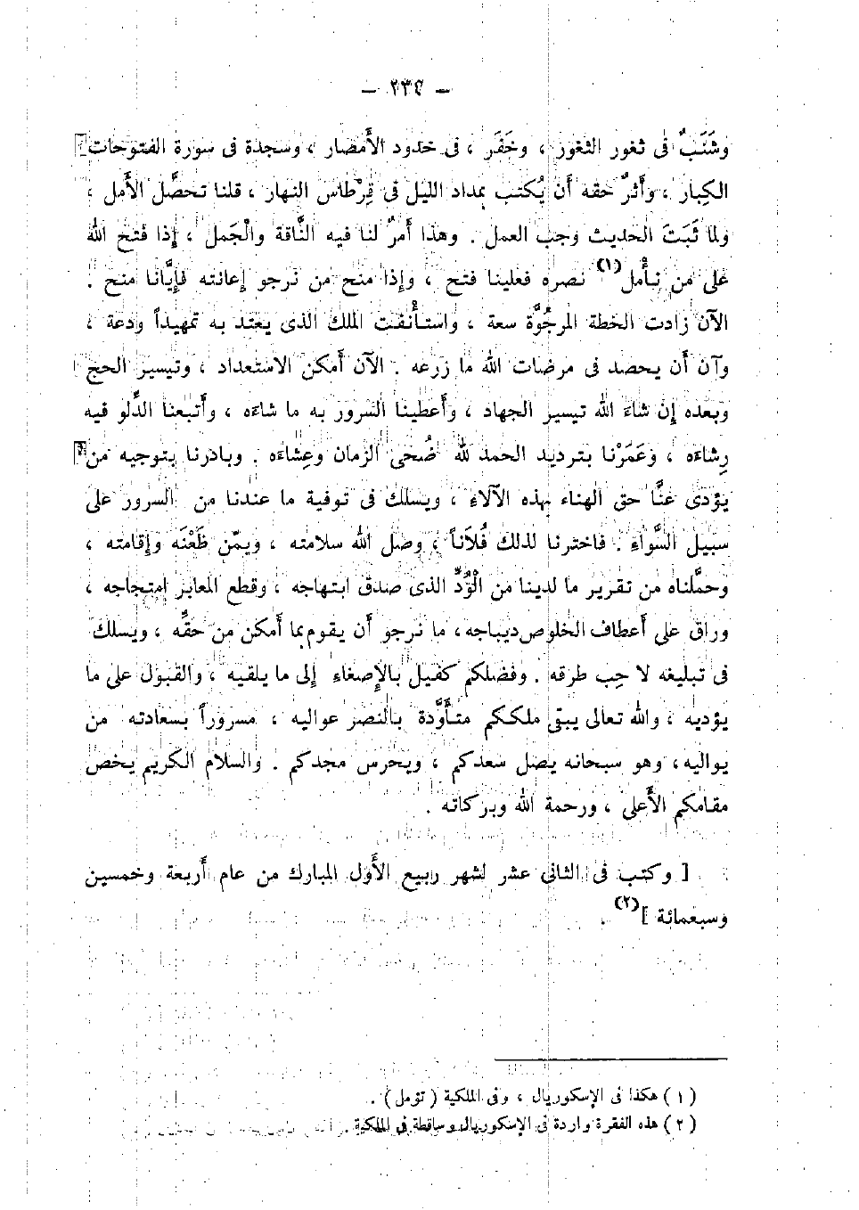 وشنب فِي ثغور الثغور، وخفر، فِي خدود الْأَمْصَار، وَسجْدَة فِي سُورَة الفتوحات الْكِبَار، وَأثر حَقه أَن يكْتب بمداد اللَّيْل فِي قرطاس النَّهَار، قُلْنَا تحصل الأمل، وَلما ثَبت الحَدِيث وَجب الْعَمَل. وَهَذَا أَمر لنا فِيهِ النَّاقة والجمل، إِذا فتح الله على من نأمل نَصره فعلينا فتح، وَإِذا منح من نرجو إعانته فإيانا منح. الْآن زَادَت الخطة المرجوة سَعَة، واستأنفت الْملك الَّذِي يعْتد بِهِ تمهيدا ودعة، وآن أَن يحصد فِي مرضات الله مَا زرعه. الْآن أمكن الاستعداد، وتيسير الْحَج وَبعده إِن شَاءَ الله تيسير الْجِهَاد، وأعطينا السرُور بِهِ مَا شاءه، وأتبعنا الدَّلْو فِيهِ رشاءه، وعمرنا بترديد الْحَمد لله ضحى الزَّمَان وعشاءه. وبادرنا بتوجيه من يُؤدى عَنَّا حق الهناء بِهَذِهِ الآلاء، ويسلك فِي تَوْفِيَة مَا عندنَا من السرُور على سَبِيل السوَاء. فاخترنا لذَلِك فلَانا، وصل الله سَلَامَته، ويمن ظعنه وإقامته، وحملناه من تَقْرِير مَا لدينا من الود الَّذِي صدق ابتهاجه، وَقطع المعابر امتجاجه، وراق على أعطاف الخلوص ديباجه، مَا نرجو أَن يقوم بِمَا أمكن من حَقه، ويسلك فِي تبليغه لَا حب طرقه. وفضلكم كَفِيل بالإصغاء إِلَى مَا يلقيه، وَالْقَبُول على مَا يُؤَدِّيه، وَالله تَعَالَى يبْقى ملككم متأودة بالنصر عواليه، مَسْرُورا بسعادته من يواليه، وَهُوَ سُبْحَانَهُ يصل سعدكم، ويحرس مجدكم. وَالسَّلَام الْكَرِيم يخص مقامكم الْأَعْلَى، وَرَحْمَة الله وَبَرَكَاته. [وَكتب فِي الثَّانِي عشر لشهر ربيع الأول الْمُبَارك من عَام أَرْبَعَة وَخمسين وَسَبْعمائة] .