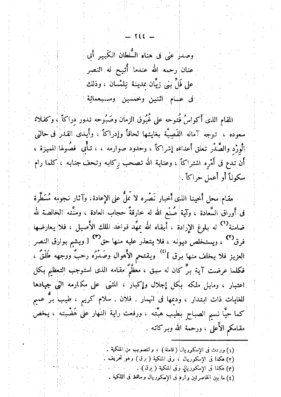 وَصدر عني فِي هناء السُّلْطَان الْكَبِير أبي عنان رَحمَه الله عِنْدَمَا أتيح لَهُ النَّصْر على فل بني زيان بِمَدِينَة تلمسان، وَذَلِكَ فِي عَام اثْنَيْنِ وَخمسين وَسَبْعمائة