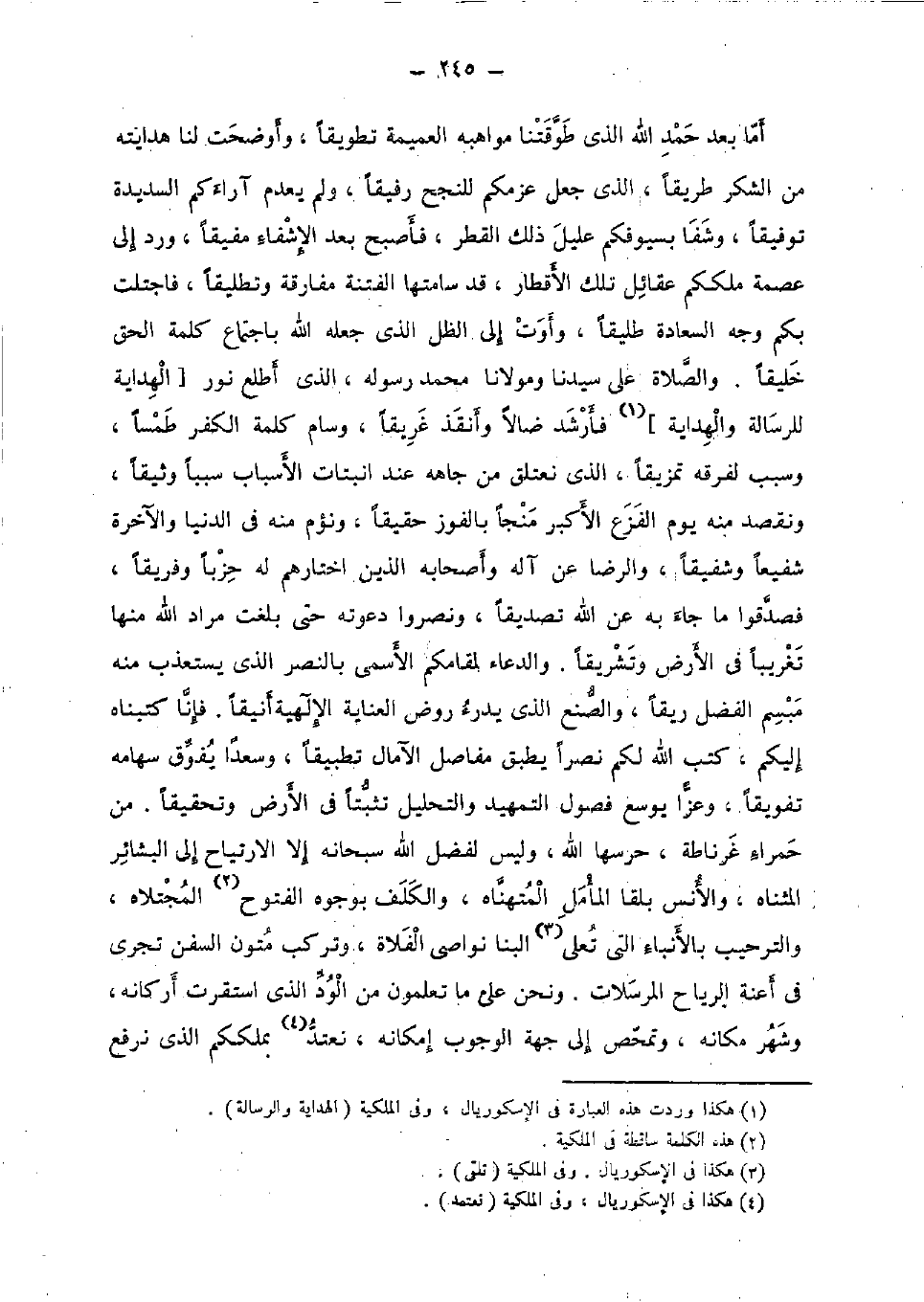 أما بعد حمد الله الَّذِي طوقتنا مواهبه العميمة تطويقا، وأوضحت لنا هدايته من الشُّكْر طَرِيقا، الَّذِي جعل عزمكم للنجح رَفِيقًا، وَلم يعْدم آراءكم السديدة تَوْفِيقًا، وشفا بسيوفكم عليل ذَلِك الْقطر، فَأصْبح بعد الإشفاء مفيقا، ورد إِلَى عصمَة ملككم عقائل تِلْكَ الأقطار، قد سامتها الْفِتْنَة مُفَارقَة وتطليقا، فاجتلت بكم وَجه السَّعَادَة طليقا، وأوت إِلَى الظل الَّذِي جعله الله باجتماع كلمة الْحق خليقا. وَالصَّلَاة على سيدنَا ومولانا مُحَمَّد رَسُوله، الَّذِي أطلع نور [الْهِدَايَة للرسالة وَالْهِدَايَة] فأرشد ضَالًّا وأنقذ غريقا، وسام كلمة الْكفْر طمسا , وَسبب لفرقة تمزيقا، الَّذِي نعتلق من جاهه عِنْد انبتات الْأَسْبَاب سَببا وثيقا، ونقصد مِنْهُ يَوْم الْفَزع الْأَكْبَر منجا بالفوز حَقِيقا، ونؤم مِنْهُ فِي الدُّنْيَا وَالْآخِرَة شَفِيعًا وشفيقا، وَالرِّضَا عَن آله وَأَصْحَابه الَّذين اخْتَارَهُمْ لَهُ حزبا وفريقا، فصدقوا مَا جَاءَ بِهِ عَن الله تَصْدِيقًا، ونصروا دَعوته حَتَّى بلغت مُرَاد الله مِنْهَا تغريبا فِي الأَرْض وتشريقا. وَالدُّعَاء لمقامكم الأسمى بالنصر الَّذِي يستعذب مِنْهُ مبسم الْفضل ريقا، والصنع الَّذِي يدرء روض الْعِنَايَة الإلهية أنيقا. فَإنَّا كتبناه إِلَيْكُم، كتب الله لكم نصرا يطبق مفاصل الآمال تطبيقا، وسعدا يفوق سهامه تفويقا، وَعزا يُوسع فُصُول التَّمْهِيد والتحليل تثبتا فِي الأَرْض وتحقيقا. من حَمْرَاء غرناطة , حرسها الله، وَلَيْسَ لفضل الله سُبْحَانَهُ إِلَّا الارتياح إِلَى البشائر المثناه، والأنس بلقا المأمل المتهناه، والكلف بِوُجُوه الْفتُوح المجتلاه، والترحيب بالأنباء الَّتِي تعلى الْبَنَّا نواصي الفلاة، وتركب متون السفن تجْرِي فِي أَعِنَّة الرِّيَاح المرسلات. وَنحن على مَا تعلمُونَ من الود الَّذِي اسْتَقَرَّتْ أَرْكَانه، وَشهر مَكَانَهُ، وتمحص إِلَى جِهَة الْوُجُوب إِمْكَانه، نعتد بملككم الَّذِي نرفع