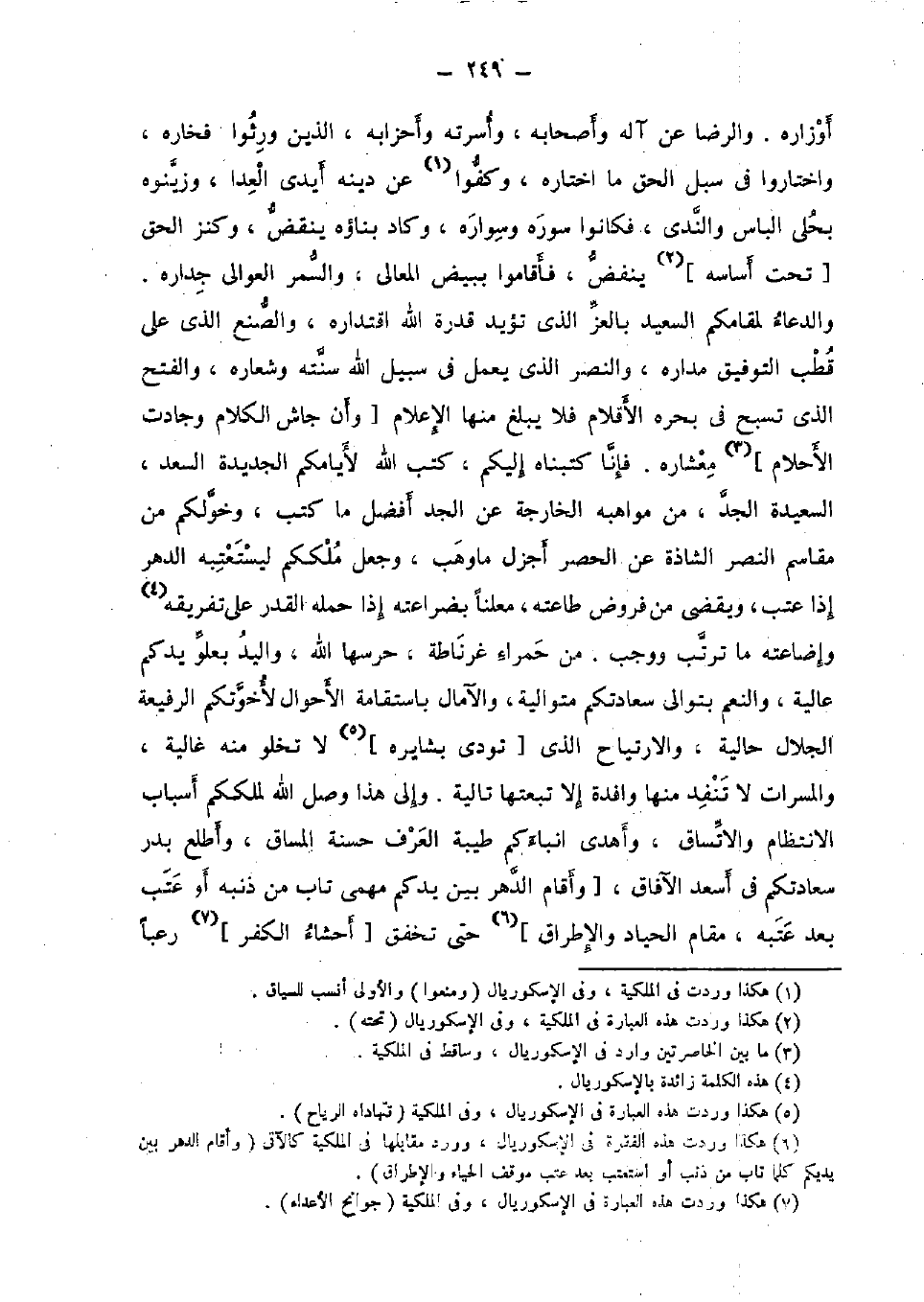 أوزاره. وَالرِّضَا عَن آله وَأَصْحَابه، وأسرته وأحزابه، الَّذين ورثوا فخاره، واختاروا فِي سبل الْحق مَا اخْتَارَهُ، وَكفوا عَن دينه أَيدي العدا، وزينوه بحلى الباس والندي، فَكَانُوا سوره وسواره، وَكَاد بِنَاؤُه ينْقض، وكنز الْحق [تَحت أساسه] ينفض، فأقاموا ببيض الْمَعَالِي، والسمر العوالي جِدَاره. وَالدُّعَاء لمقامكم السعيد بالعز الَّذِي تؤيد قدرَة الله اقتداره، والصنع الَّذِي على قطب التَّوْفِيق مَدَاره، والنصر الَّذِي يعْمل فِي سَبِيل الله سنته وشعاره، وَالْفَتْح الَّذِي تسبح فِي بحره الأقلام فَلَا يبلغ مِنْهَا الْإِعْلَام [وَأَن جاش الْكَلَام وجادت الأحلام] معشاره. فَإنَّا كتبناه إِلَيْكُم، كتب الله لأيامكم الجديدة السعد، السعيدة الْجد، من مواهبه الْخَارِجَة عَن الْجد أفضل مَا كتب، وخولكم من مقاسم النَّصْر الشاذة عَن الْحصْر أجزل مَا وهب، وَجعل ملككم ليستعتبه الدَّهْر إِذا عتب، وَيَقْضِي من فروض طَاعَته، مُعْلنا بضراعته إِذا حمله الْقدر على تفريقه وإضاعته مَا ترَتّب وَوَجَب. من حَمْرَاء غرناطة، حرسها الله، وَالْيَد بعلو يدكم عالية، وَالنعَم بتوالي سعادتكم مُتَوَالِيَة، والآمال باستقامة الْأَحْوَال لأخوتكم الرفيعة الْجلَال حَالية، والارتياح الَّذِي [تودي بشايره] لَا تَخْلُو مِنْهُ غَالِيَة، والمسرات لَا تنفذ مِنْهَا وافدة إِلَّا تبعتها تالية. وَإِلَى هَذَا وصل الله لملككم أَسبَاب الانتظام والاتساق، وَأهْدى انباءكم طيبَة الْعرف حَسَنَة المساق، وأطلع بدر سعادتكم فِي أسعد الْآفَاق، [وَأقَام الدَّهْر بَين يدكم مهمى تَابَ من ذَنبه أَو عتب بعد عَتبه، مقَام الحياد والإطراق] حَتَّى تخفق [أحشاء الْكفْر] رعْبًا