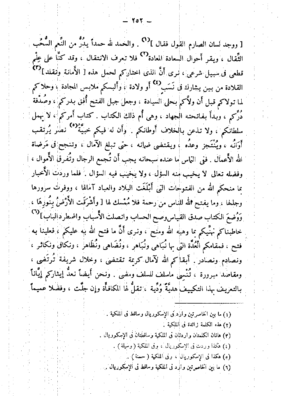 [وَوجد لِسَان الصارم القَوْل فَقَالَ] . وَالْحَمْد لله حمدا يدر من النعم السحب الثقال، ويقر أَحْوَال السَّعَادَة الْمُعَادَة فَلَا تعرف الِانْتِقَال، وَقد كُنَّا على علم قَطْعِيّ فِي سَبِيل شَرْعِي، نرى أَن الَّذِي اختاركم لحمل هَذِه [الْأَمَانَة وتقلد] القلادة من بَين يُشَارك فِي نسب أَو ولادَة، وألبسكم ملابس المجادة، وحلاكم لما تولاكم قبل أَن ولاكم بحلى السِّيَادَة، وَجعل جبل الْفَتْح أفق بدركم، وصدفة دركم، وَبَدَأَ بفاتحته الْجِهَاد، وَهِي أم ذَلِك الْكتاب. كتاب أَمركُم، لَا يهمل سلطانكم، وَلَا تذعن بِالْخِلَافِ أوطانكم. وَأَن لَهُ فِيكُم خبية نصر يرتقب أَوَانه، وينتجز وعده، ويقتضى ضَمَانه حَتَّى تبلغ الآمال، وتنجح فِي مرضاة الله الْأَعْمَال. فَفِي التمَاس مَا عِنْده سُبْحَانَهُ يجب أَن تجمع الرِّجَال وتفرق الْأَمْوَال، وفضله تَعَالَى لَا يخيب مِنْهُ السؤل، وَلَا يخيب فِيهِ السُّؤَال. فَلَمَّا وَردت الْأَخْبَار بِمَا منحكم الله من الفتوحات الَّتِي أبلغت الْبِلَاد والعباد آمالها، ووفرت سرورها وجذلها، وَمَا يفتح الله للنَّاس من رَحْمَة فَلَا مُمْسك لَهَا [وأشرقت الأَرْض بنورها، وَوضع الْكتاب صدق الْقيَاس وَصَحَّ الْحساب واتصلت الْأَسْبَاب واضطرد الْبَاب] خاطبناكم نهنيكم بِمَا وهبه الله ومنح، ونرى أَن مَا فتح الله بِهِ عَلَيْكُم، فعلينا بِهِ فتح، فمقامكم الْعدة الَّتِي بهَا نباهي ونباهر، ونضاهي ونظاهر، ونكافي ونكاثر، ونصادم ونصادر. أبقاكم الله لآمال كَرِيمَة تَقْتَضِي، وخلال شريفة ترتضى، ومقاصد مبرورة، تنسى مَا سلف للسلف وَمضى. وَنحن أَيْضا نعد إيثاركم إيانا بالتعريف بِهَذَا التكييف هَدِيَّة ودية، تقل لَهَا الْمُكَافَأَة وَإِن جلت، وفضلا عميما