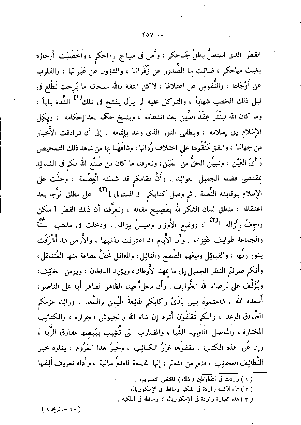 الْقطر الَّذِي استظل بِظِل جناحكم، وَأمن فِي سياج رماحكم، وأخضبت أرجاؤه بغيث سماحكم، ضَاقَتْ بهَا الصُّدُور عَن زفراتها، والشؤون عَن عبراتها، والقلوب عَن أوجالها، والنفوس عَن اعتلالها، لاكن الثِّقَة بِاللَّه سُبْحَانَهُ مَا بَرحت تطلع فِي ليل ذَلِك الْخطب شهابا، والتوكل عَلَيْهِ لم يزل يفتح فِي تِلْكَ الشدَّة بَابا، وَمَا كَانَ الله لينثر عقد الدّين بعد انتظامه، وينسخ حكمه بعد إحكامه، ويكل الْإِسْلَام إِلَى إِسْلَامه، ويطفي النُّور الَّذِي وعد بإتمامه، إِلَى أَن ترادفت الْأَخْبَار من جهاتها، وَاتفقَ منقولها عَن اخْتِلَاف رواتها، وشافهنا بهَا من شَاهد ذَلِك التمحيص رَأْي الْعين، وَتبين الْحق من المين، وتعرفنا مَا كَانَ من صنع الله لكم فِي الشدائد بِمُقْتَضى فَضله الْجَمِيل العوائد، وَأَن مقامكم قد شملته الْعِصْمَة، وحلت على الْإِسْلَام بوقايته النِّعْمَة. ثمَّ وصل كتابكُمْ [المستولي] على مُطلق الرجا بعد اعتقاله، منطق لِسَان الشُّكْر لله بفصيح مقاله، وتعرفنا أَن ذَلِك الْقطر [سكن راجف زلزاله] ، وَوضع الأوزار وطيس نزاله، وَدخلت فِي مَذْهَب السّنة وَالْجَمَاعَة طوايف اعتزاله. وَأَن الْأَيَّام قد اعْترفت بذنبها، وَالْأَرْض قد أشرفت بِنور رَبهَا، والقبائل وسعهم الصفح والنائل، والمعاقل خف للطاعة مِنْهَا المتثاقل، وأنكم صرفتم النّظر الْجَمِيل إِلَى مَا يمهد الأوطان، وَيُؤَيّد السُّلْطَان، ويؤمن الْخَائِف، ويؤلف على مرضاة الله الطوائف. وَأَن مَحل أخينا الظَّاهِر الطَّاهِر أَبَا عَليّ النَّاصِر، أسعده الله، قدمتموه بَين يَدي ركابكم طَائِعَة الْيمن والسعد، ورائد عزمكم الصَّادِق الْوَعْد، وأنكم تقفون أَثَره إِن شَاءَ الله بالجيوش الجرارة، والكتائب المختارة، والمناصل الْمَاضِيَة الشبا، وَالْمُضَارب الَّتِي تشيب ببيضها مفارق الرِّبَا، وَإِن غرر هَذِه الْكتب، تقفوها غرر الْكَتَائِب، وَخبر هَذَا المروم، يتلوه خبر اللطائف الْعَجَائِب، فَنعم من قدمتم، إِنَّهَا لمقدمة لِلْعَدو سالبة، وأداة تَعْرِيف ألفها