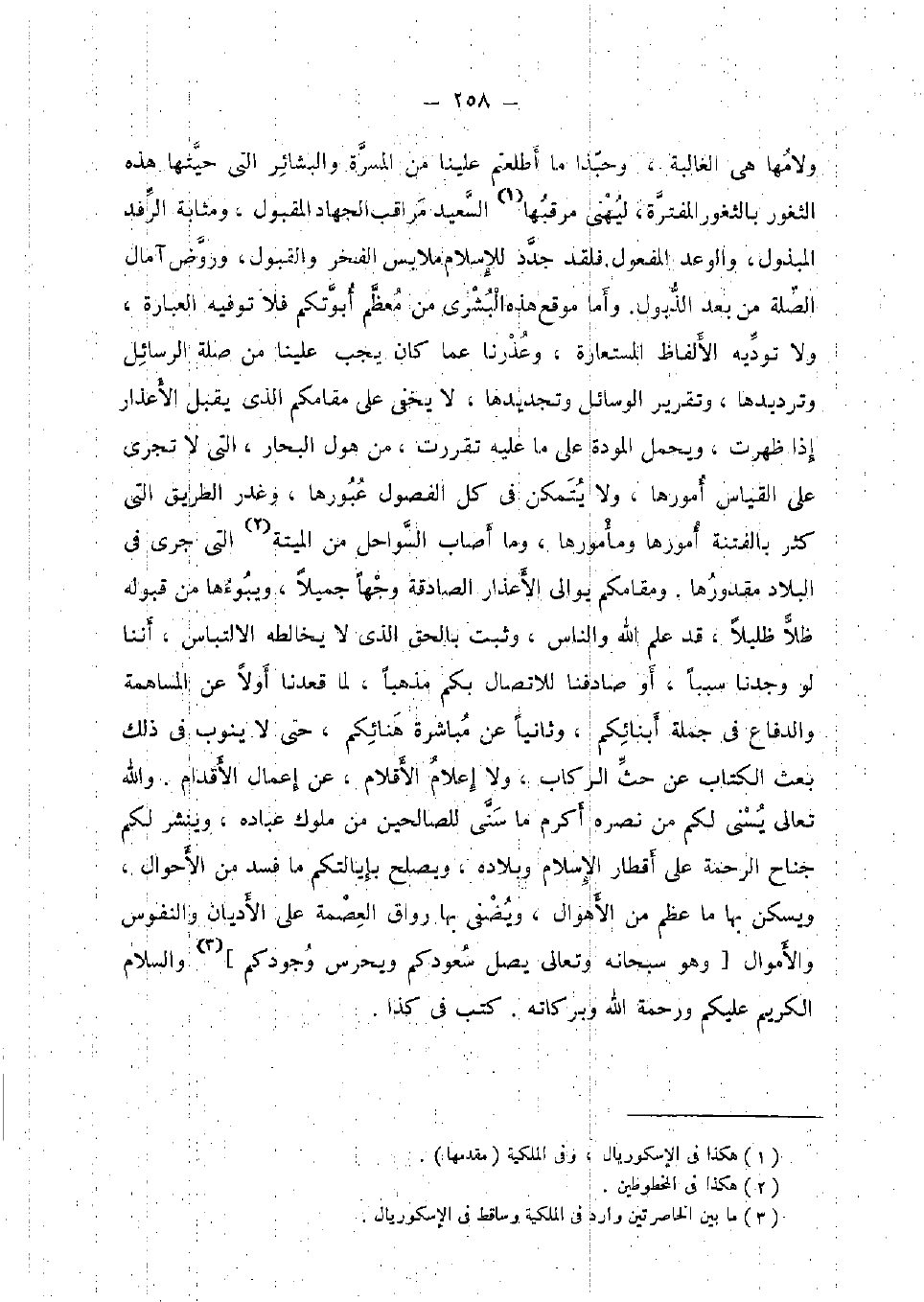ولامها هِيَ الْغَالِبَة، وحبذا مَا أطلعْتُم علينا من المسرة والبشائر الَّتِي حيتها هَذِه الثغور بالثغور المفترة، ليهنى مرقبها السعيد مراقب الْجِهَاد المقبول، ومثابة الرفد المبذول، والوعد الْمَفْعُول. فَلَقَد جدد لِلْإِسْلَامِ ملابس الْفَخر وَالْقَبُول، وَروض آمال الصِّلَة من بعد الذبول. وَأما موقع هَذِه الْبُشْرَى من مُعظم أبوتكم فَلَا توفيه الْعبارَة وَلَا توديه الْأَلْفَاظ المستعارة، وعذرنا عَمَّا كَانَ يجب علينا من صلَة الرسائل وَترد يَدهَا، وَتَقْرِير الْوَسَائِل، وعذرنا عَمَّا كَانَ يجب علينا من صلَة الرسائل وتردديها، وَتَقْرِير الْوَسَائِل وتجديدها، لَا يخفى على مقامكم الَّذِي يقبل الْأَعْذَار إِذا ظَهرت، وَيحمل الْمَوَدَّة على مَا عَلَيْهِ تقررت، من هول الْبحار، الَّتِي لَا تجْرِي على الْقيَاس أمورها، وَلَا يتَمَكَّن فِي كل الْفُصُول عبورها، وغدر الطَّرِيق الَّتِي كثر بالفتنة أمورها ومأمورها، وَمَا أصَاب السواحل من الْميتَة الَّتِي جرى فِي الْبِلَاد مقدورها. ومقامكم يوالي الْأَعْذَار الصادقة وَجها جميلا، ويبوءها من قبُوله ظلا ظليلا، قد علم الله وَالنَّاس، وَثَبت بِالْحَقِّ الَّذِي لَا يخالطه الالتباس، أننا لَو وجدنَا سَببا، أَو صادفنا للاتصال بكم مذهبا، لما قعدنا أَولا عَن المساهمة والدفاع فِي جملَة أَبْنَائِكُم، وَثَانِيا عَن مُبَاشرَة هنائكم، حَتَّى لَا يَنُوب فِي ذَلِك بعث الْكتاب عَن حث الركاب، وَلَا إِعْلَام الأقلام، عَن إِعْمَال الْأَقْدَام. وَالله تَعَالَى يسنى لكم من نَصره أكْرم مَا سنى للصالحين من مُلُوك عباده، وينشر لكم جنَاح الرَّحْمَة على أقطار الْإِسْلَام وبلاده، وَيصْلح بإيالتكم مَا فسد فِي الْأَحْوَال، ويسكن بهَا مَا عظم من الْأَهْوَال، ويضفي بهَا رواق الْعِصْمَة على الْأَدْيَان والنفوس وَالْأَمْوَال [وَهُوَ سُبْحَانَهُ وَتَعَالَى يصل سعودكم ويحرس وجودكم] وَالسَّلَام الْكَرِيم عَلَيْكُم وَرَحْمَة الله وَبَرَكَاته. كتب فِي كَذَا.